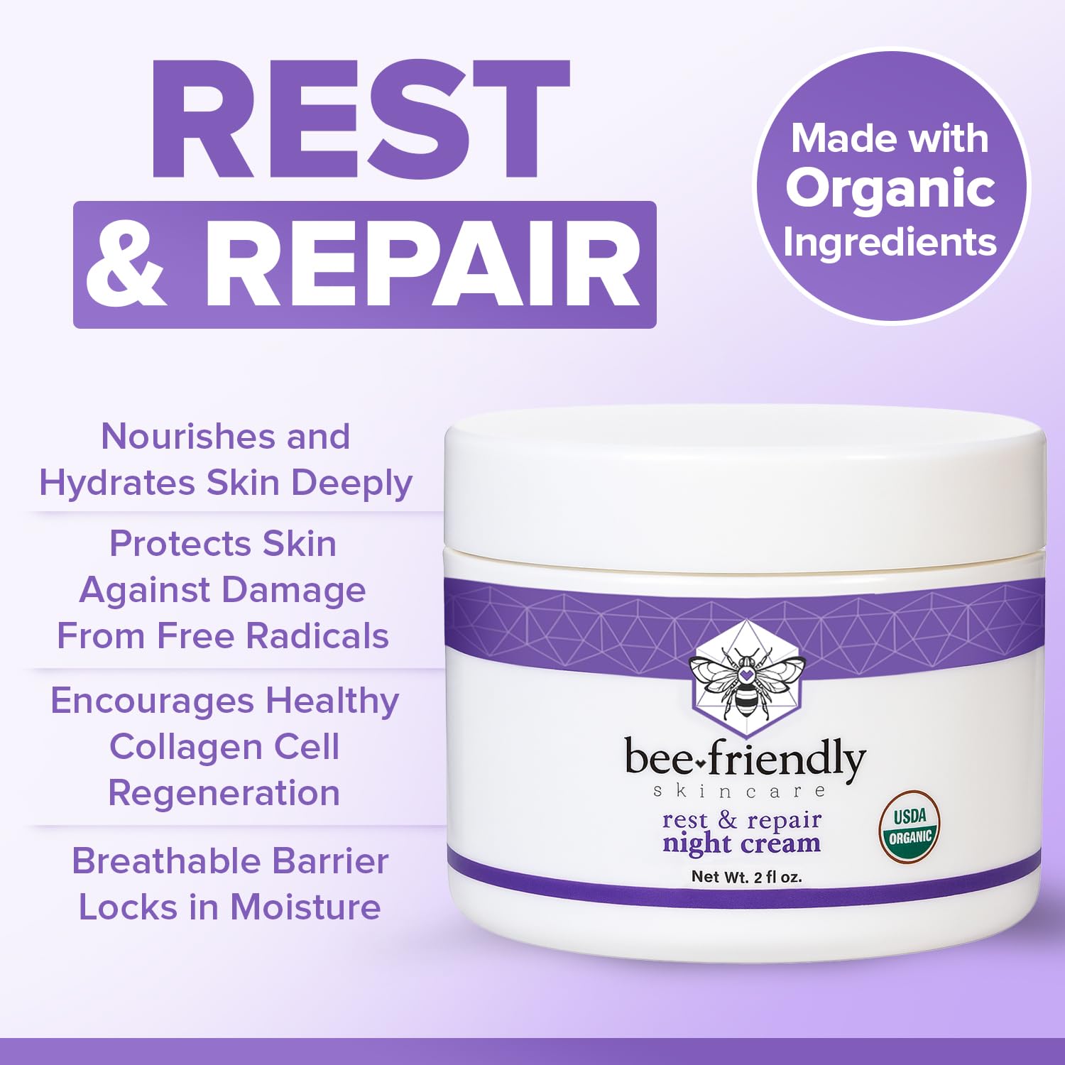 BeeFriendly Organic Night Cream, USDA Certified Organic, Deep Hydrating & Moisturizing Night Time Eye, Face, Neck & Decollete Cream for Women and Men, Anti Aging, Anti Wrinkle 2 oz