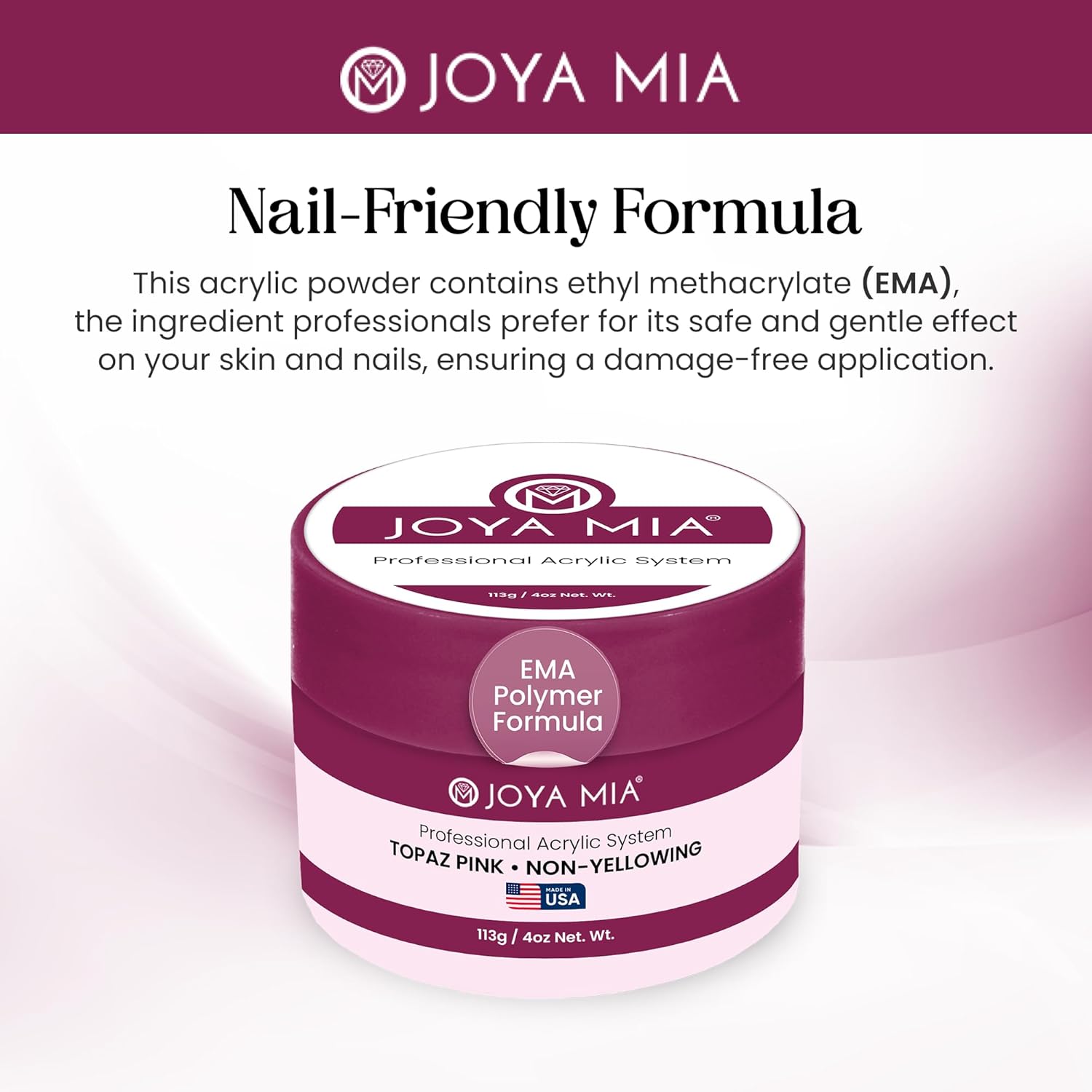- MMA-Free Formula - Other color acrylic powder may contain harmful chemicals such as methyl methacrylate (MMA). But not Joya Mia products! Our acrylic nails powder is completely MMA-free, so your nails and skin won’t be exposed to anything damaging.
