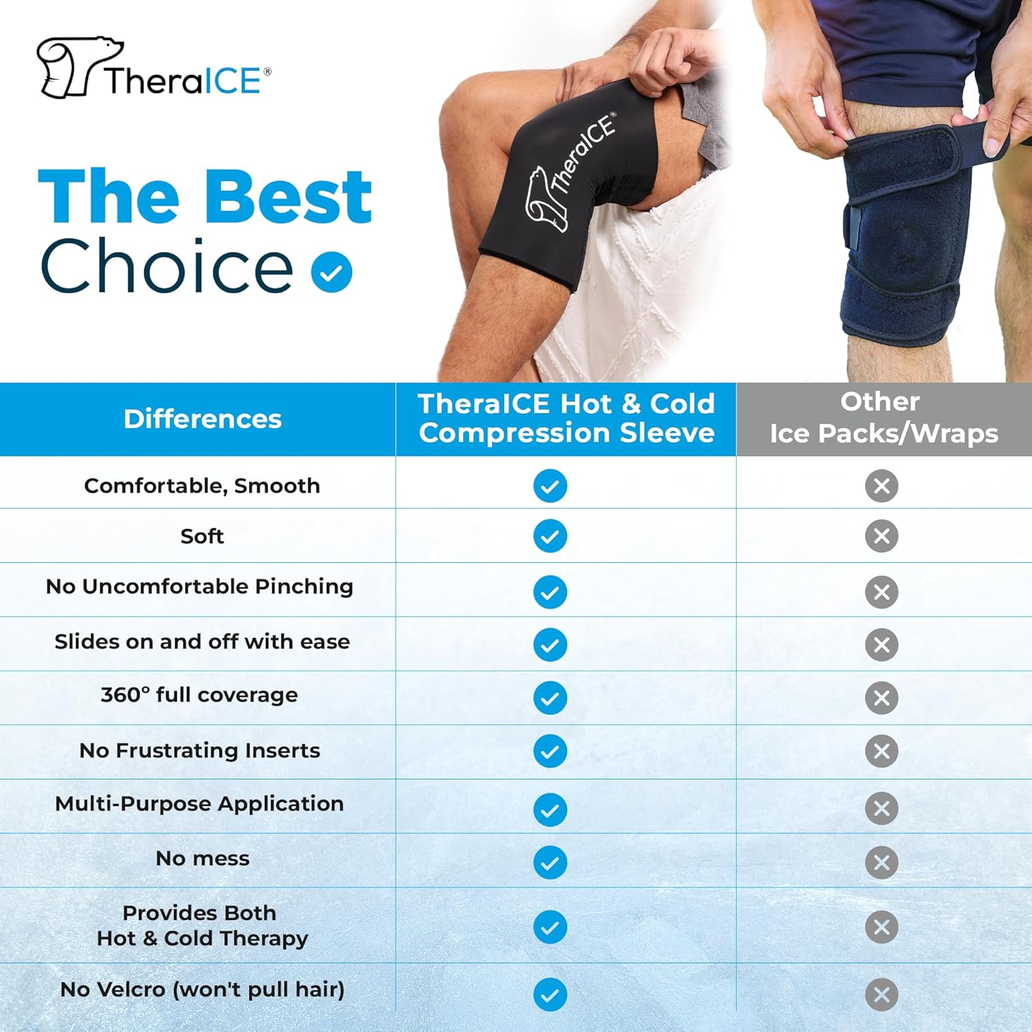 - MESS-FREE REUSABLE COLD THERAPY: Forget dripping ice packs—this mess-free knee ice pack delivers long-lasting cold or heat. Use it directly on skin or over clothes as a hot cold compression sleeve or ice pack for knees reusable. Doubles as a theraice knee sleeve or heating pad for knee. This ice pack knee wrap suits athletes and everyday users alike. A dependable choice for ice packs for injuries reusable knee, compression sleeves, or cold compress reusable options for daily relief.