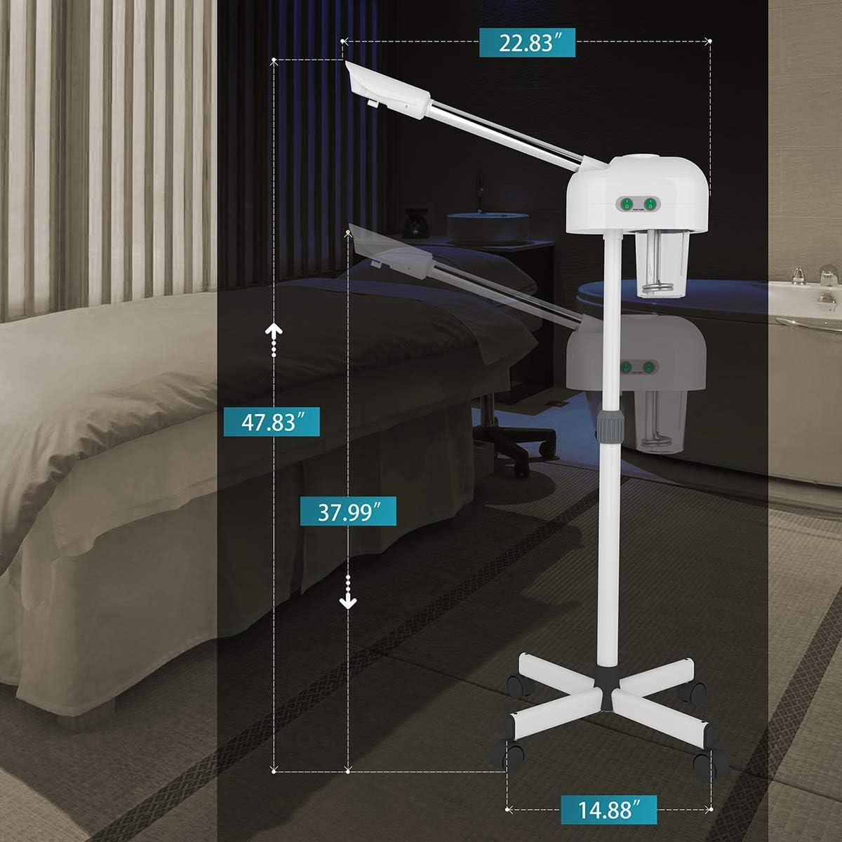 - ★ EXQUISITE WORKMANSHIP : Titanium atomizing disc, more foggy, more fine, can extend spraying time. High quality SS pipe, sturdy and durable, no rust. Thicker high capacity water cup, can store 600ml water. The head of the machine is free to rotate 360°. Adjustable height from 38.1" - 46.4". Easy moving with universal wheels.