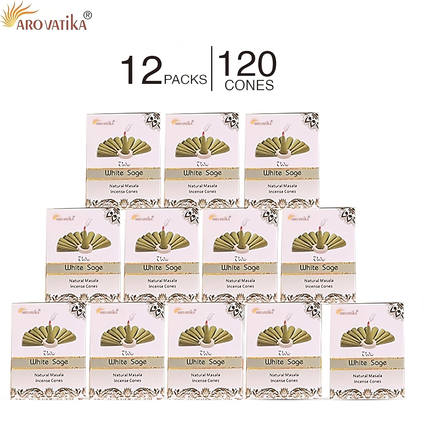 ARO VATIKA Vedic White Sage Natural Masala 120 Incense Cones in Pack of 12 Boxes| Best for Prayer, Reiki, Meditation and Relaxation | Burn Time- 25 mins