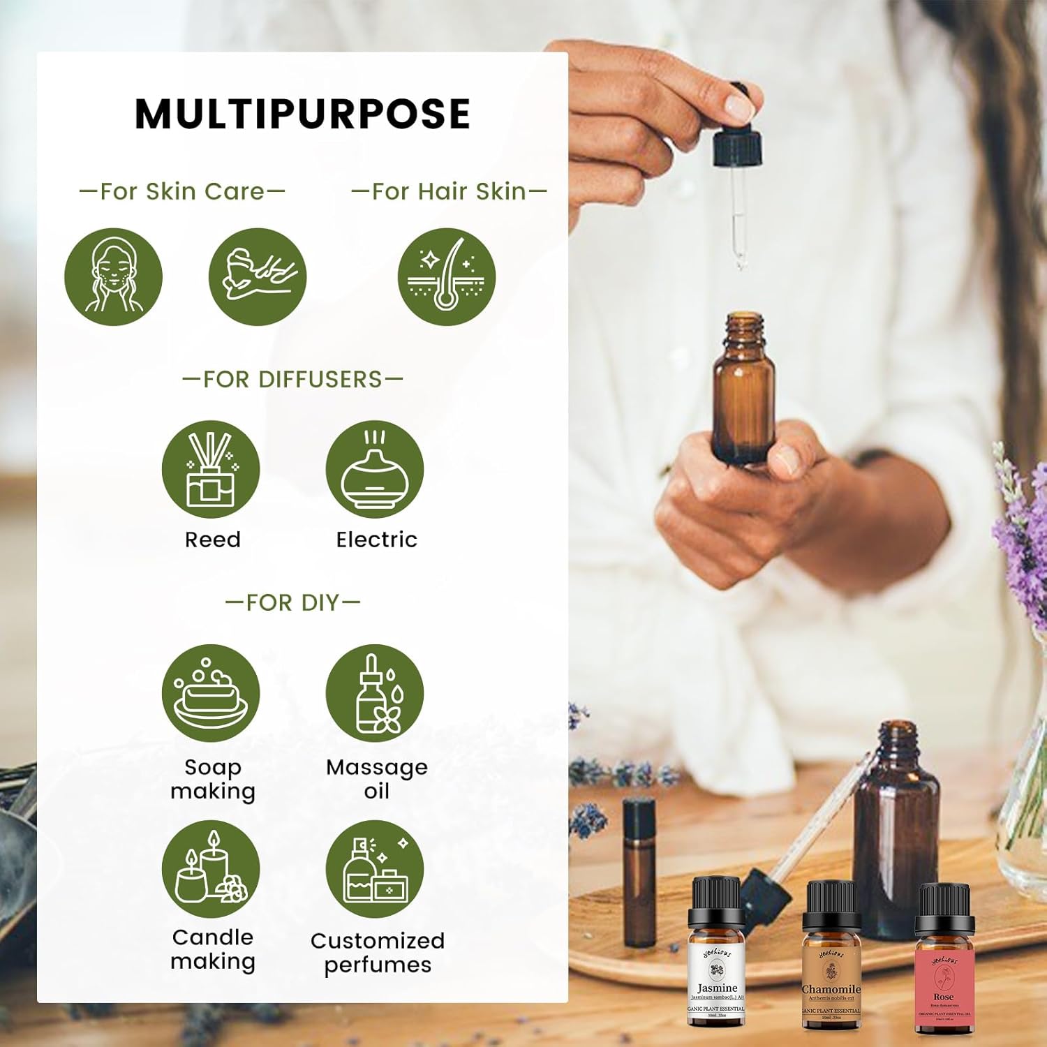 - 100% pure organic rose, jasmine and chamomile essential oil: no additives or fillers. Essential oils are used for aromatherapy, baths, hair care, saunas, air freshening, or soaps and bath, etc.