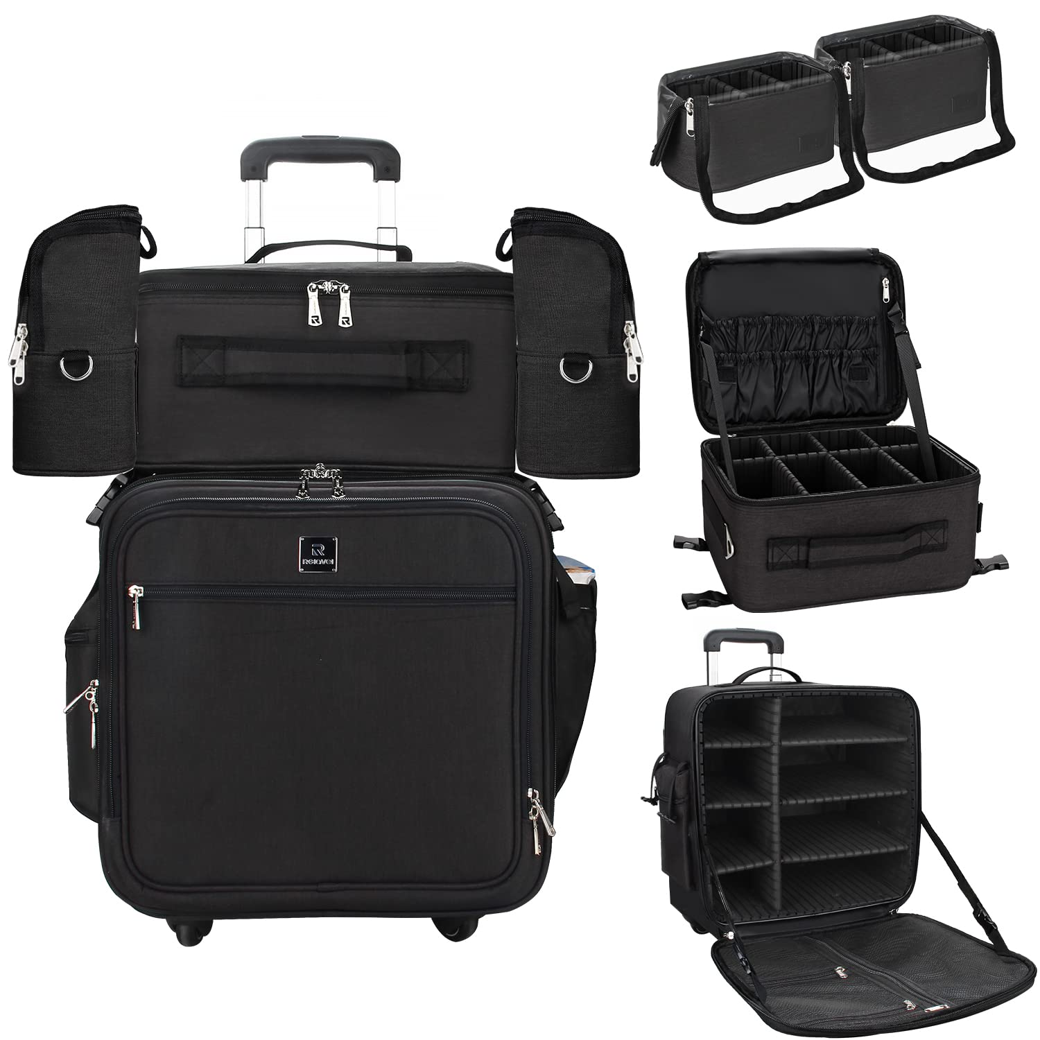 Relavel Rolling Makeup Case Professional Makeup Train Case Makeup Artist Travel Organizer 4 in 1 with Detachable Cosmetic Case and Dual Makeup Brush Case and Wheels (Black, 4-Pack)