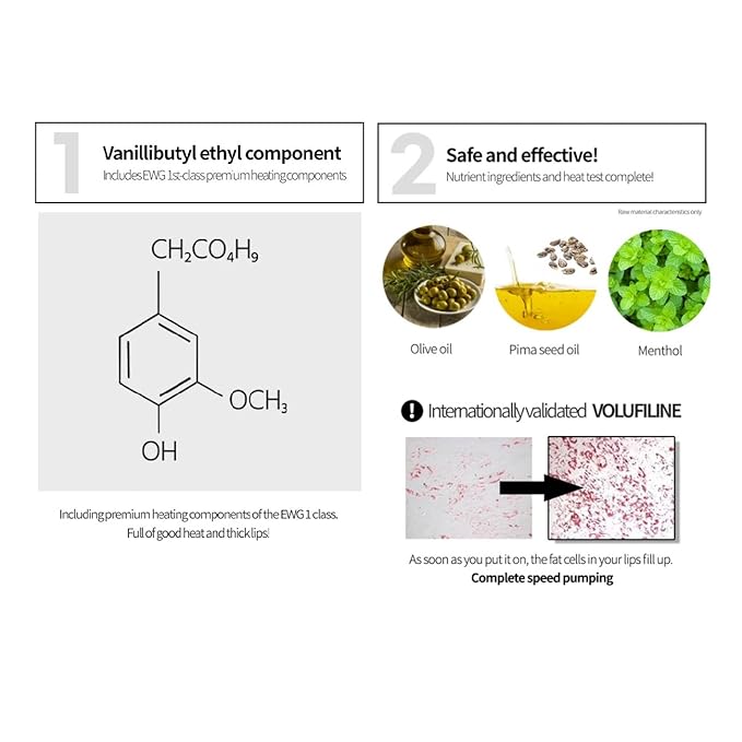 - [Extremely Powerful and Safe] Using EWG 1st-class premium heating component with FDA prescription. Moisturizing lip care, lip coat, and gloss effect last for 30 minutes to 2 hours. Safe volufiline plumper effect with FDA prescription materials