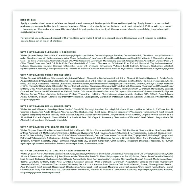 - Our full Ultra Hydration collection for your softest, smoothest skin yet: Ultra Hydration Cleanser is powered by aloe, vitamin E, rosehip, and sweet orange; Ultra Hydration Toner delivers a soothing dose of hyaluronic acid and clarifying witch hazel; Ultra Hydration Serum is packed with rich, moisturizing ingredients; Ultra Hydration Eye Cream smooths and soothes under-eyes; Ultra Hydration Moisturizing Cream provides an extra dose of nourishment for long-lasting hydration