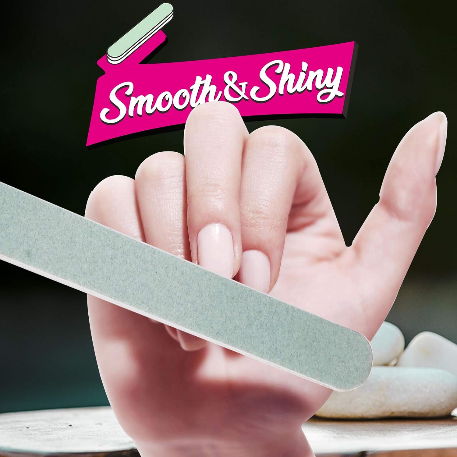 - Nail Files and Buffer: 100/180 Grit nail file are made of premium adhesive tape and emery board materials, ideal for removing nail gel polish and trimming your nail to desired length and shape. 100/180 grit double sided suitable for natural or fake nails. Nail Polishing Buffer have 2 different grit side, green one is 400 grit, you can use it refine nail surface, white side is 4000 grit, the best helper for you to smooth nail surface and polish it.