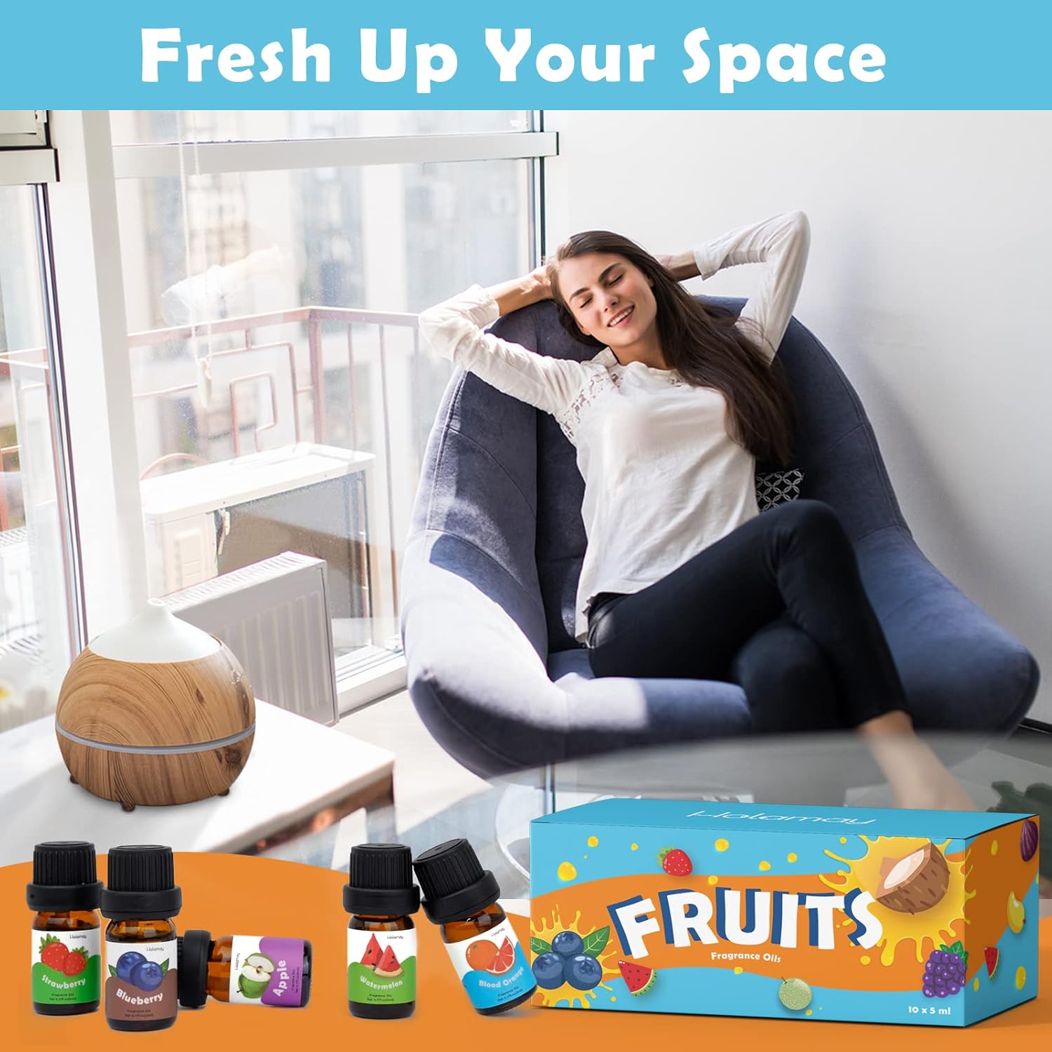 - Enjoy the Fresh Fruits Scent in Winter; If you are looking for a set that will add a seasonal freshness around you, our aromatherapy diffuser oils is an ideal choice, all fruity scents are rich and complex, take you into an orchard