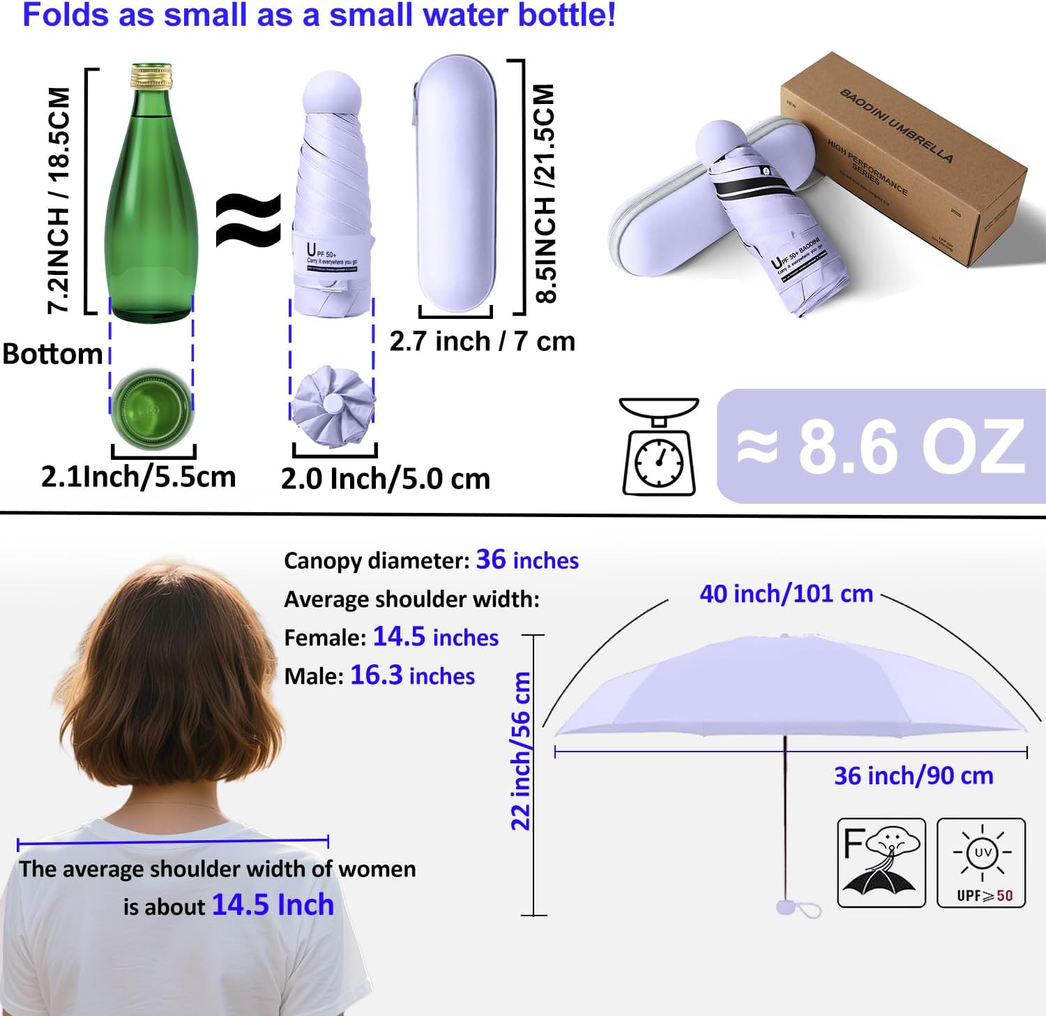 - Pocket umbrella: With a 40-inch arc and a 35.4-inch diameter, this mini travel umbrella is perfect for concealing in your purse or bag when you’re on the go! Folds to an ultra-compact 6.9 inches, makes the umbrella great for travel, as this super lightweight umbrella collapses about the size of your palm