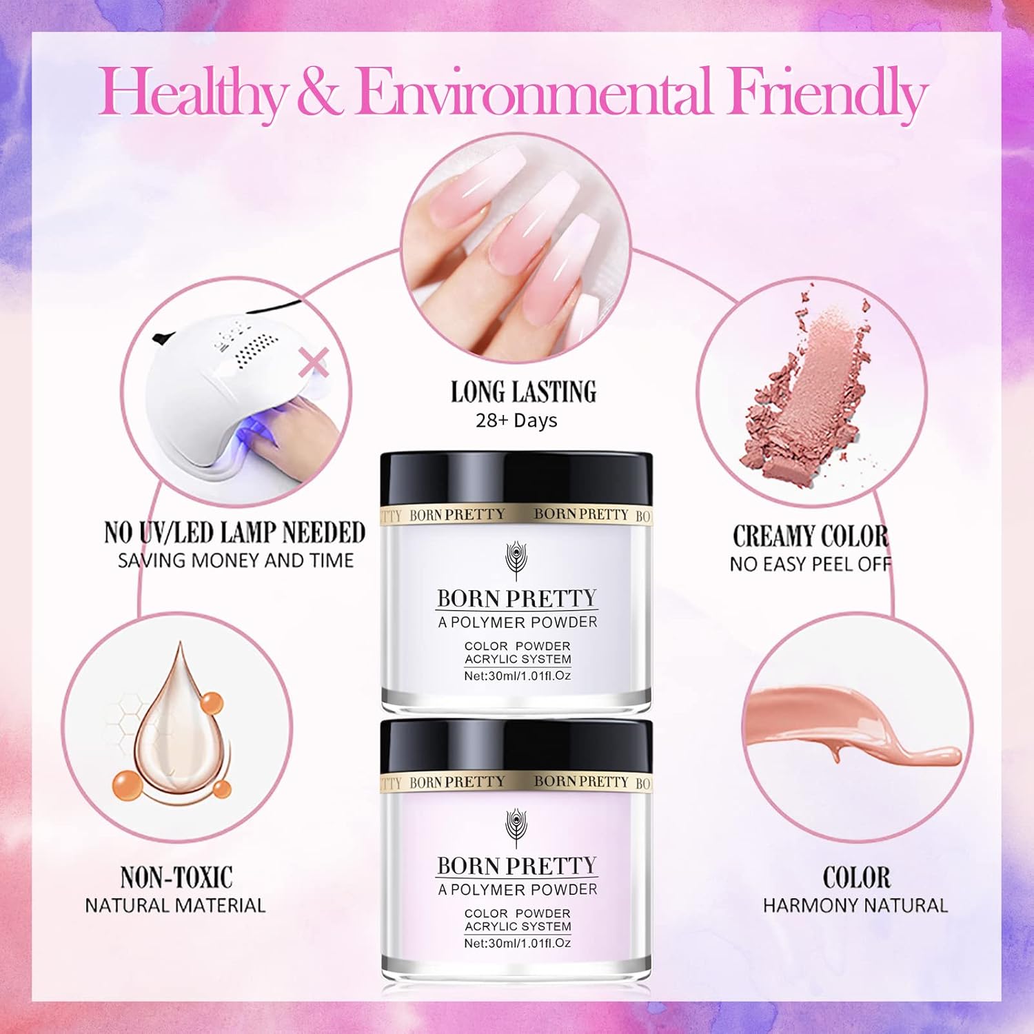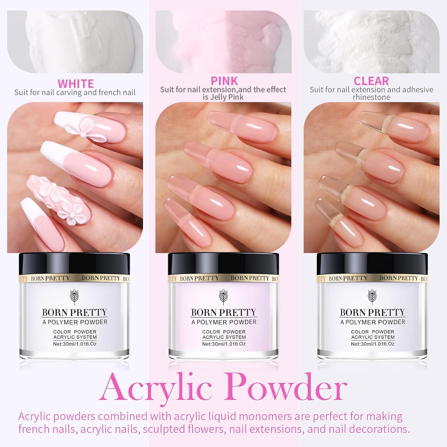 - HIGH QUALITY LONG LASTING:BORN PRETTY acrylic liquid monomer non-yellowing and superior adhesion,acrylic liquid monomer is formulated with UV stabilizers to ensure color clarity and prevent yellowing or dulling. It can ensure best bond to natural nail plate and ensures an impeccable shine without needing a primer. born pretty acrylic powder system kit is long-lasting, chip-resistant, and advanced manufacture skill. It can last for about 2-3 weeks even without nail lamp curing.