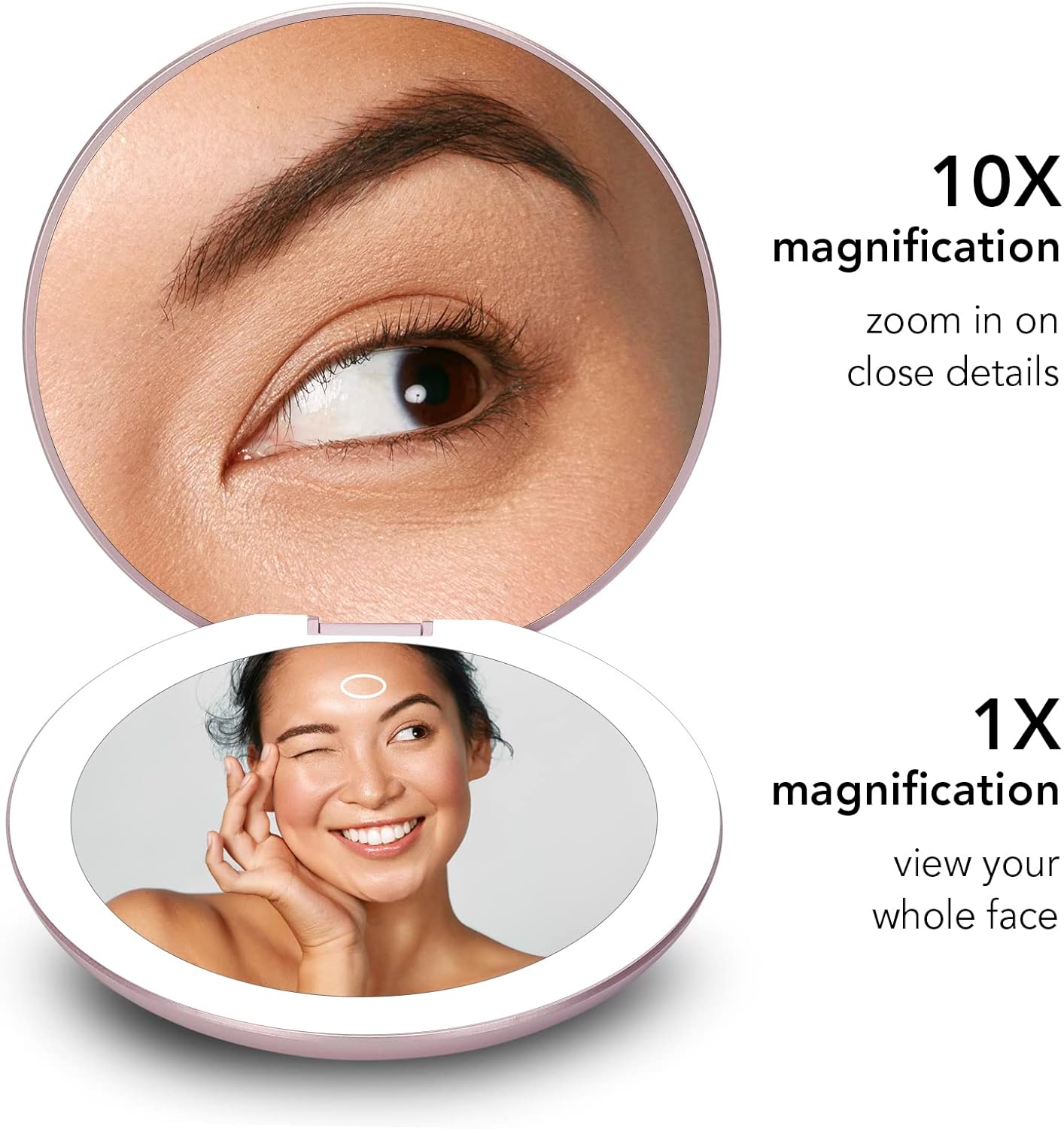 - Double-sided magnification (1x and 10x) so you can apply a full face of makeup, do a quick touch-up on the go, or focus on a detailed task like tweezing or inserting contact lenses