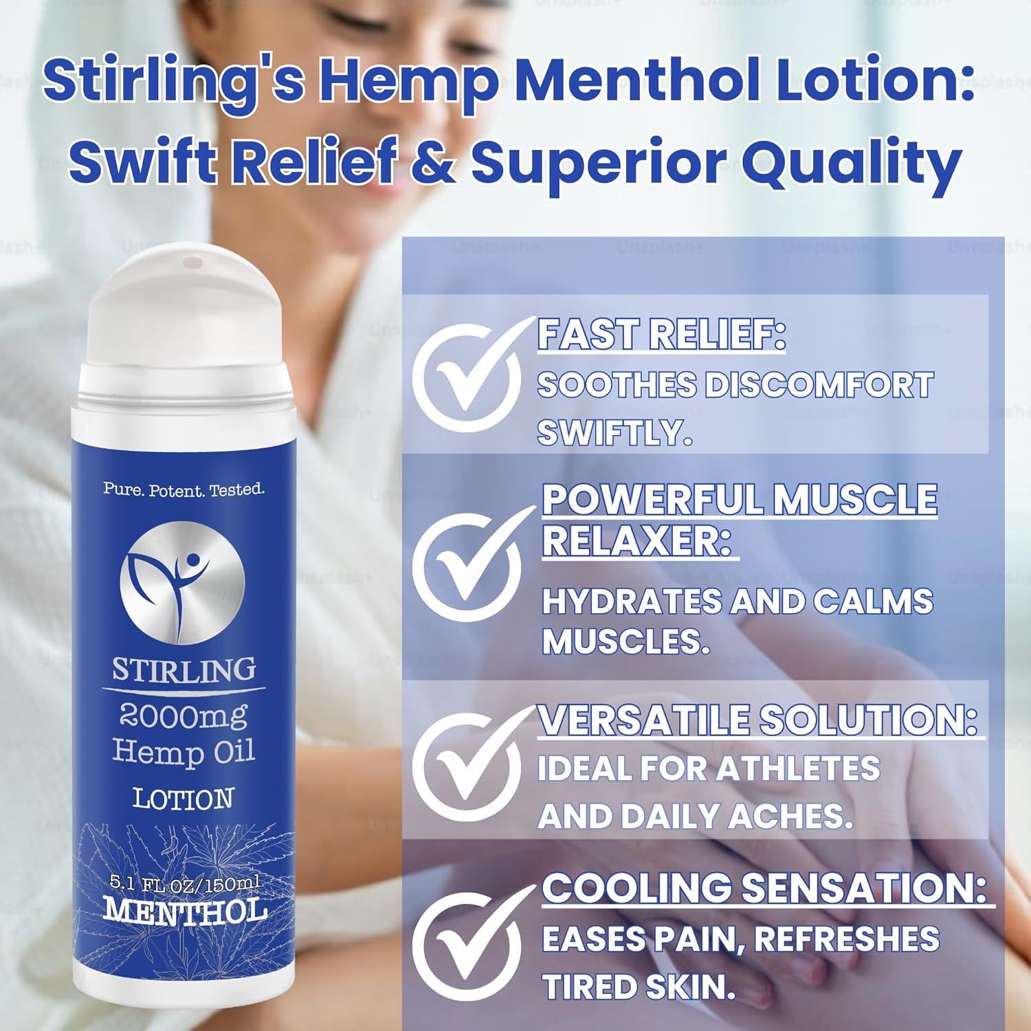 STIRLING Menthol Lotion + Hemp Oil β Maximum strength relief with cooling menthol and 100% pure hemp oil to soothe joints, relax muscles, and hydrate with aloe vera. 5 fl oz. (2000mg, Menthol)