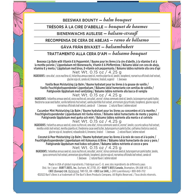 Burt's Bees Lip Balm Mothers Day Gifts for Mom - Balm Bouquet Set, Original Beeswax, Vanilla Bean, Cucumber Mint, Coconut & Pear Pack, Natural Origin Lip Treatment With Beeswax, 4 Tubes, 0.15 oz.