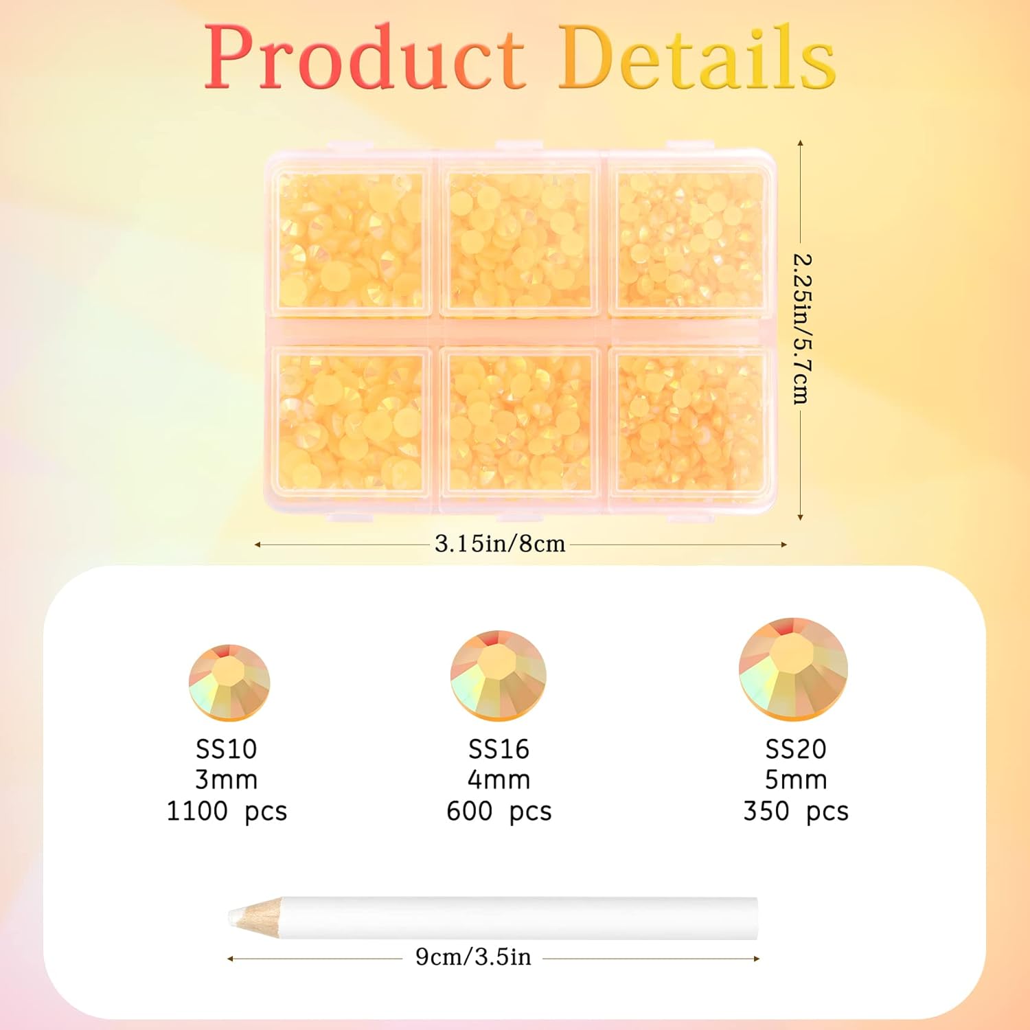 - 3 Sizes Rhinestones Set with Pick Up Pen: 2050 pcs per box. Round flat backs &Non Hotfix, SS10 (3mm) 1100PCS, SS16 (4mm) 600PCS / SS20(5mm) 350PCS.