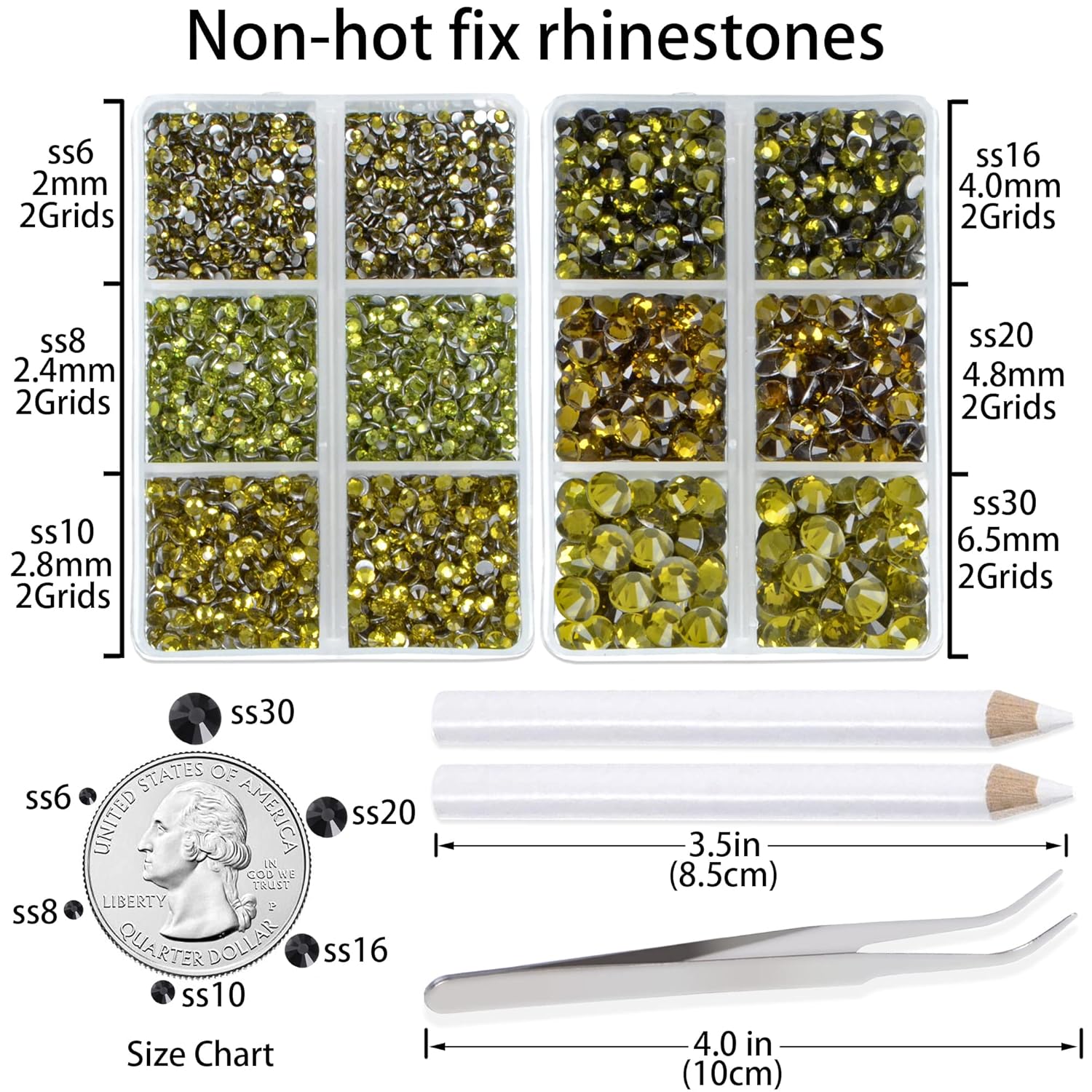 LPBeads 6000 Pieces Olivine Non Hotfix Rhinestones 6 Sizes Round Crystal Glass Flat Back Rhinestones with Tweezers and Picking Pen for Nail Art Crafts Clothes Bags DIY