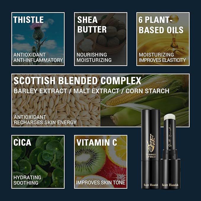 - SCOTTISH LIP BALM FOR MEN: Scott Hamish Courage Lip Balm contains Scottish Blended Complex, a blend of grain extracts containing barley, malt, and corn to replenish the lip with moisture. The Milk Thistle & Cica Extracts create a soft layer to protect the skin.