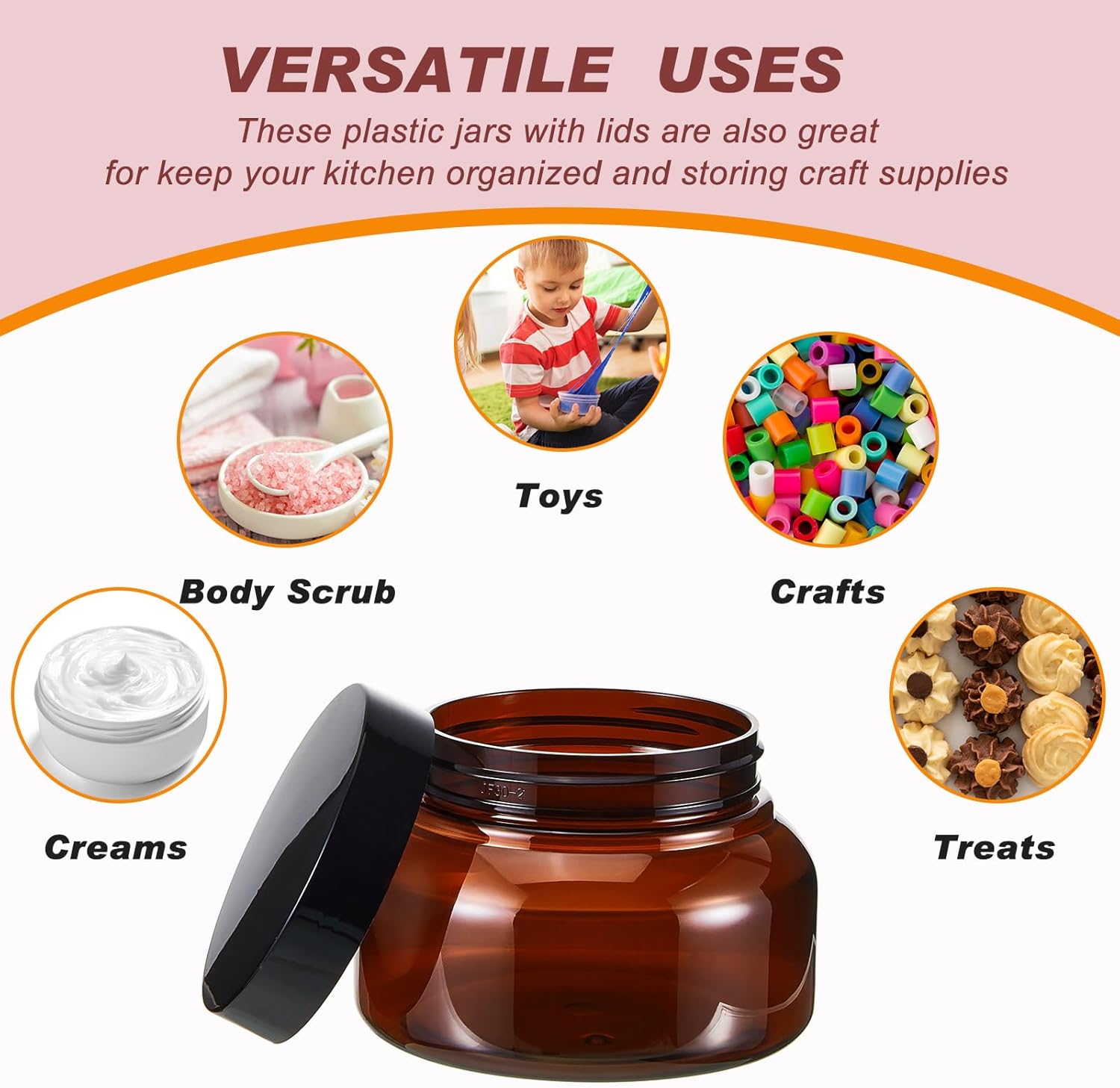 Tessco 24 Pack Plastic Jars with Lids Labels Empty Clear Plastic Jars Round Refillable Cosmetic Containers Body Butter Containers Bulk Sugar Scrub Bottle for Make Up(8 oz,Brown)