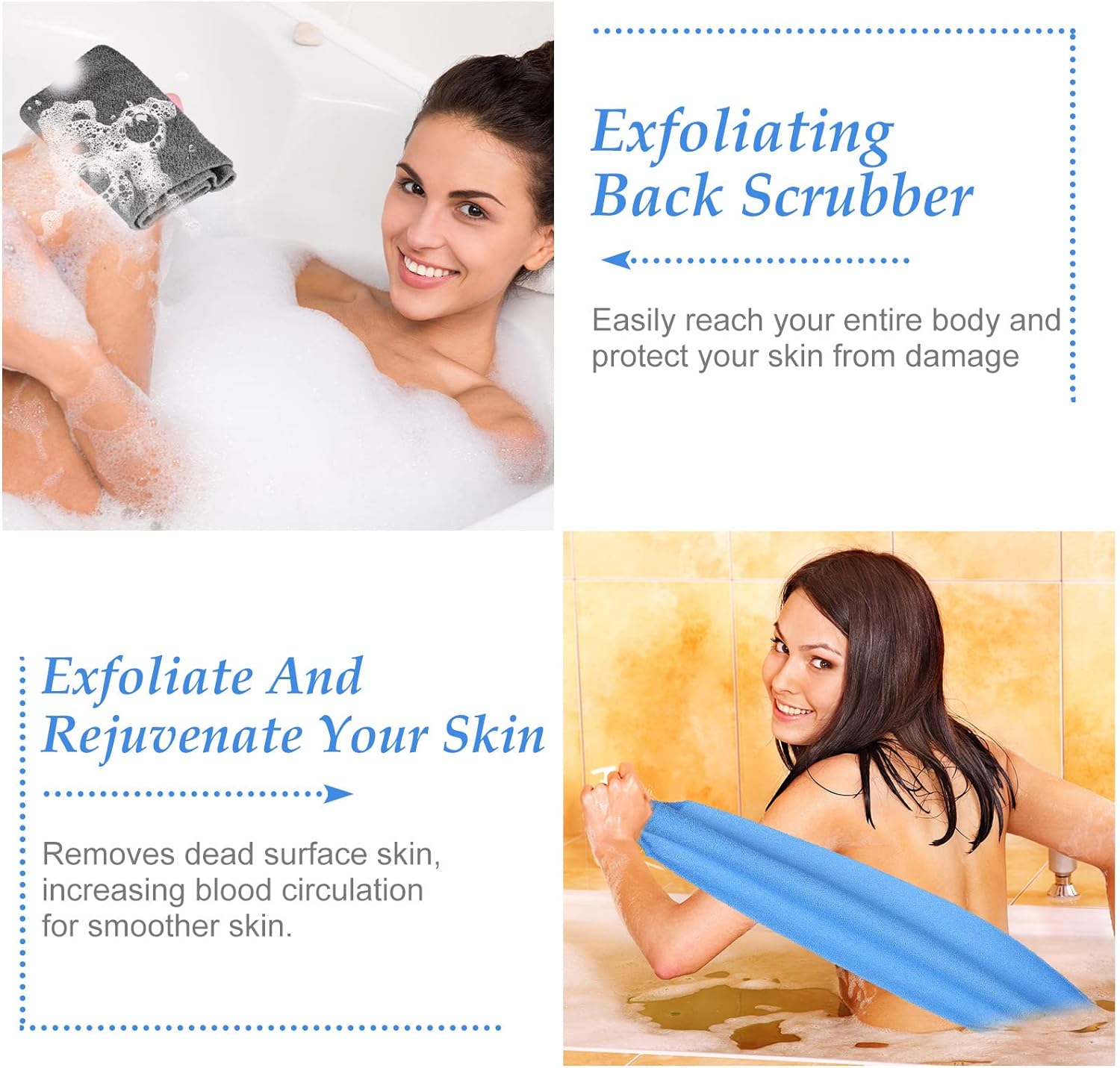Moukeren Exfoliating Back Scrubber with Handles 4 Pack Nylon Back Exfoliator Extended Length Washers Scrubbers Stretchable Pull Strap Exfoliating Washcloth(Dark Blue, Gray, Beige, Fluorescent Green)
