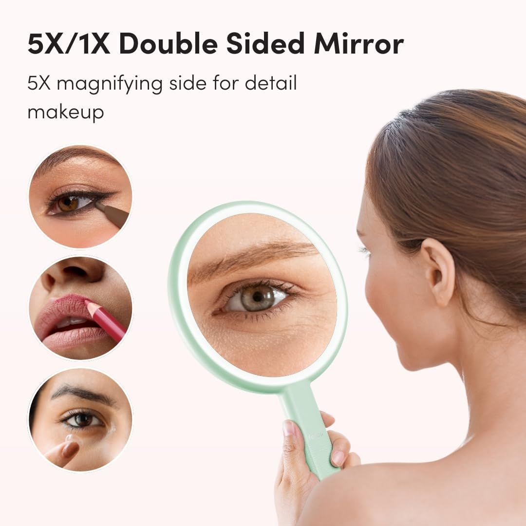 Fancii Cami Handheld Travel Makeup Mirror with Lights, Rechargeable, Extra Large, Double Sided 5X / 1X Magnifying Mirror - 3 Color Lighting, Handheld or Vanity (Pistachio)