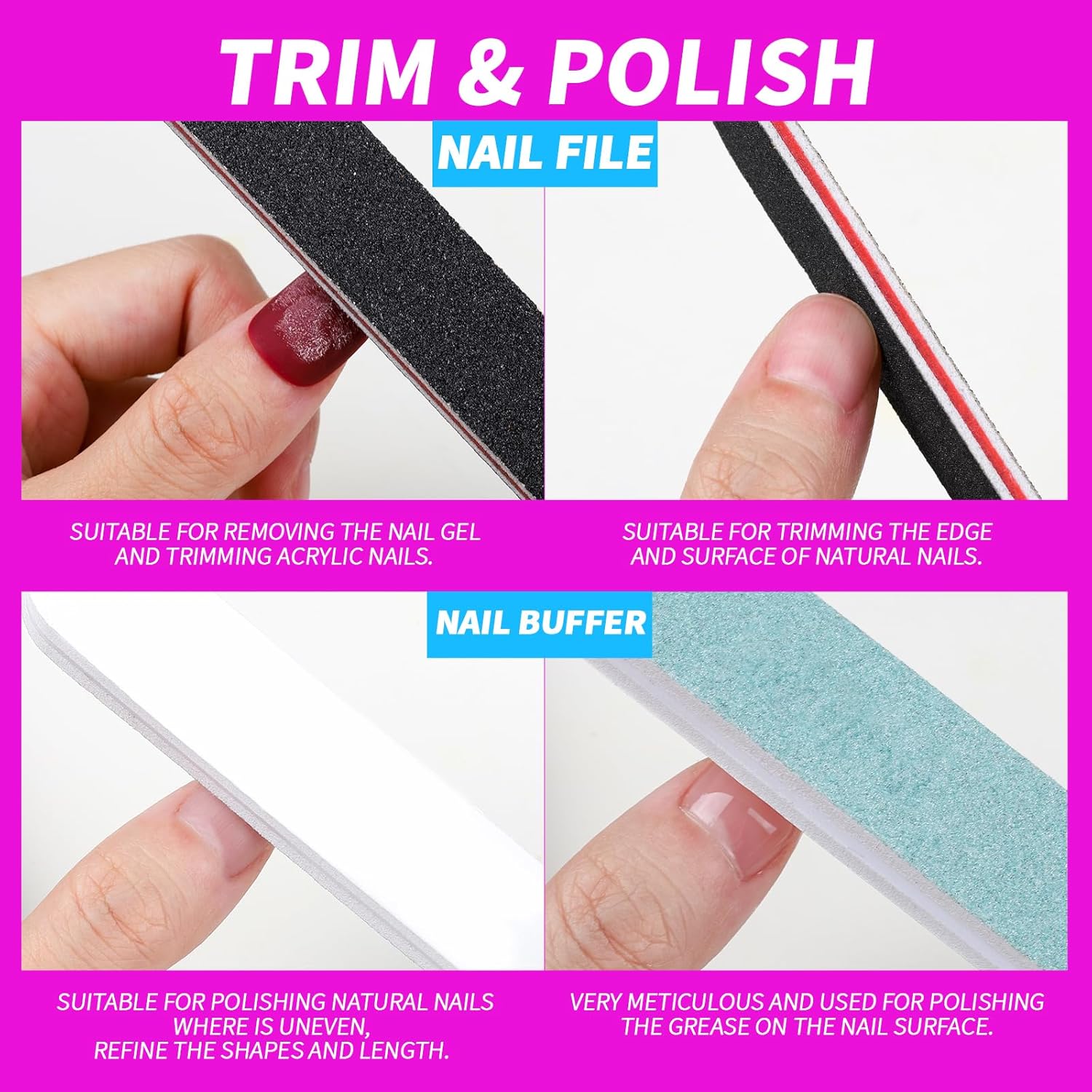 - Nail File and Buffer Block: Double sided 100/180 grit can help remove nail gel and trim your nail to desired length and shape, suitable for natural or fake nails. Nail buffer also have 2 different grit side, green one is 1000 grit, you can use it refine nail surface. White side is 4000 grit, the best helper for you to smooth nail surface and polish it. If there is any nail dust on nail file or nail surface, please use nail brush to clean it.