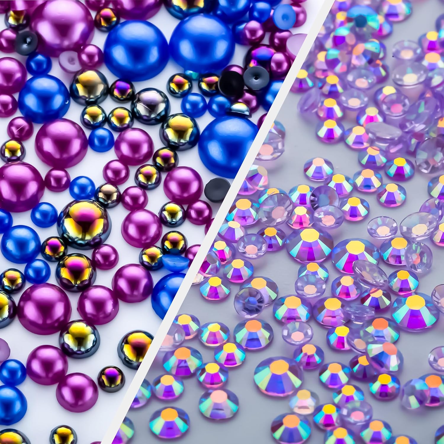 - What You Will Receive: 60g(30g*2)mixed size flat back pearls and rhinestones. 3*Rhinestone Glue. 1* wax pencil for rhinestones. 1*Pencil sharpener(color random). The mix half round pearls and rhinestones can make more beautiful handicrafts for your friends, parents, yourselfs on any festivals.If you need a mixed size pack of pearl rhinestones