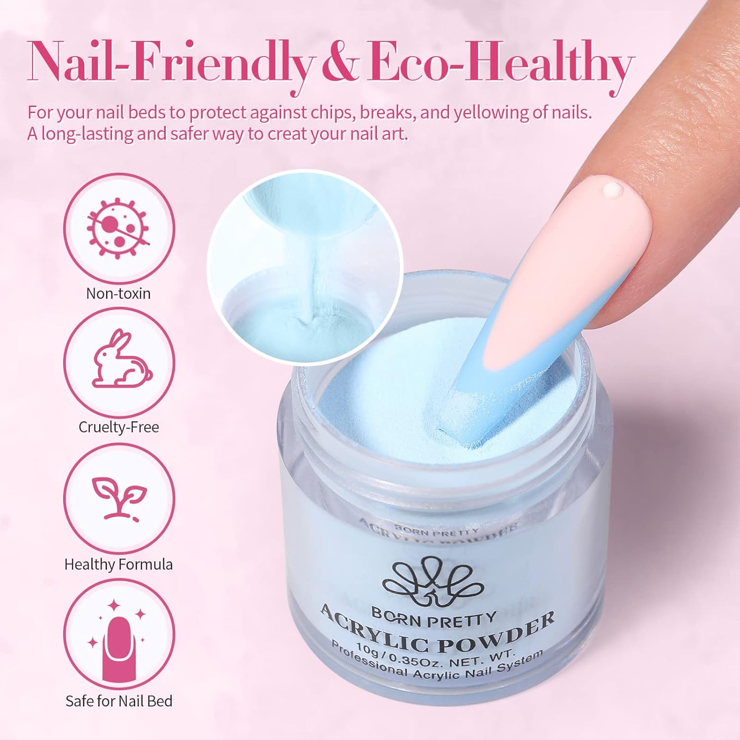 - ❤HEALTHY & NO NEEDED NAIL LAMP: BORN PRETTY acrylic powder nail kit is made of advanced healthy formula, no animal testing, 11-free, will not cause any discomfort to your precious nails, and is friendly to nails. BORN PRETTY acrylic powder colors system no need nail lamp.