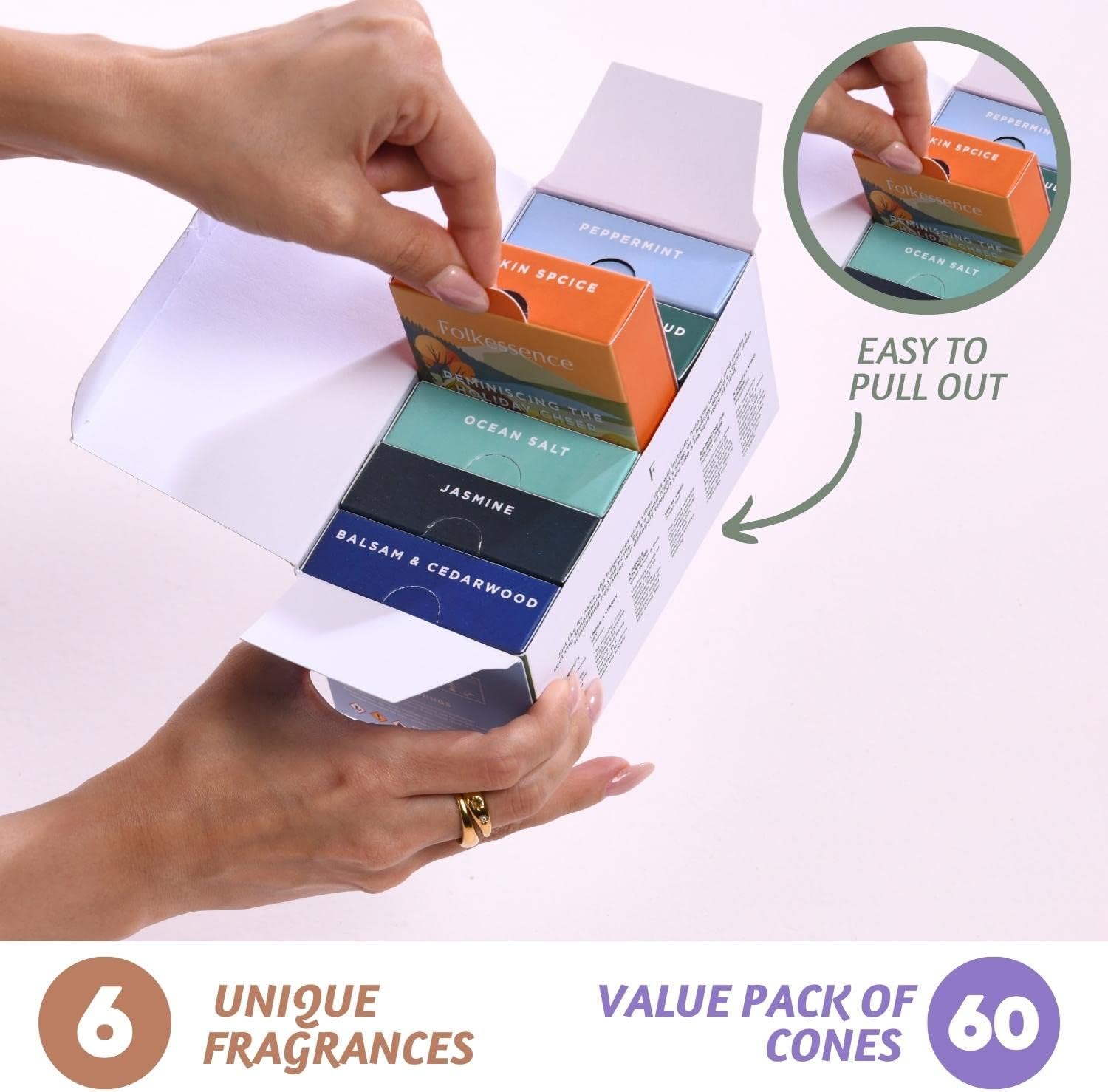 - [ VALUE PACK - Set of 6 ] : Our scented insense cones for meditation with infused incense come in a value pack of widely used aromatherapy ingredients that include Balsam Cedarwood, Jasmine, White Woods& Oud, Ocean Salt, Pumpkin Spice, Peppermint essential oils making it a complete fragrance experience.