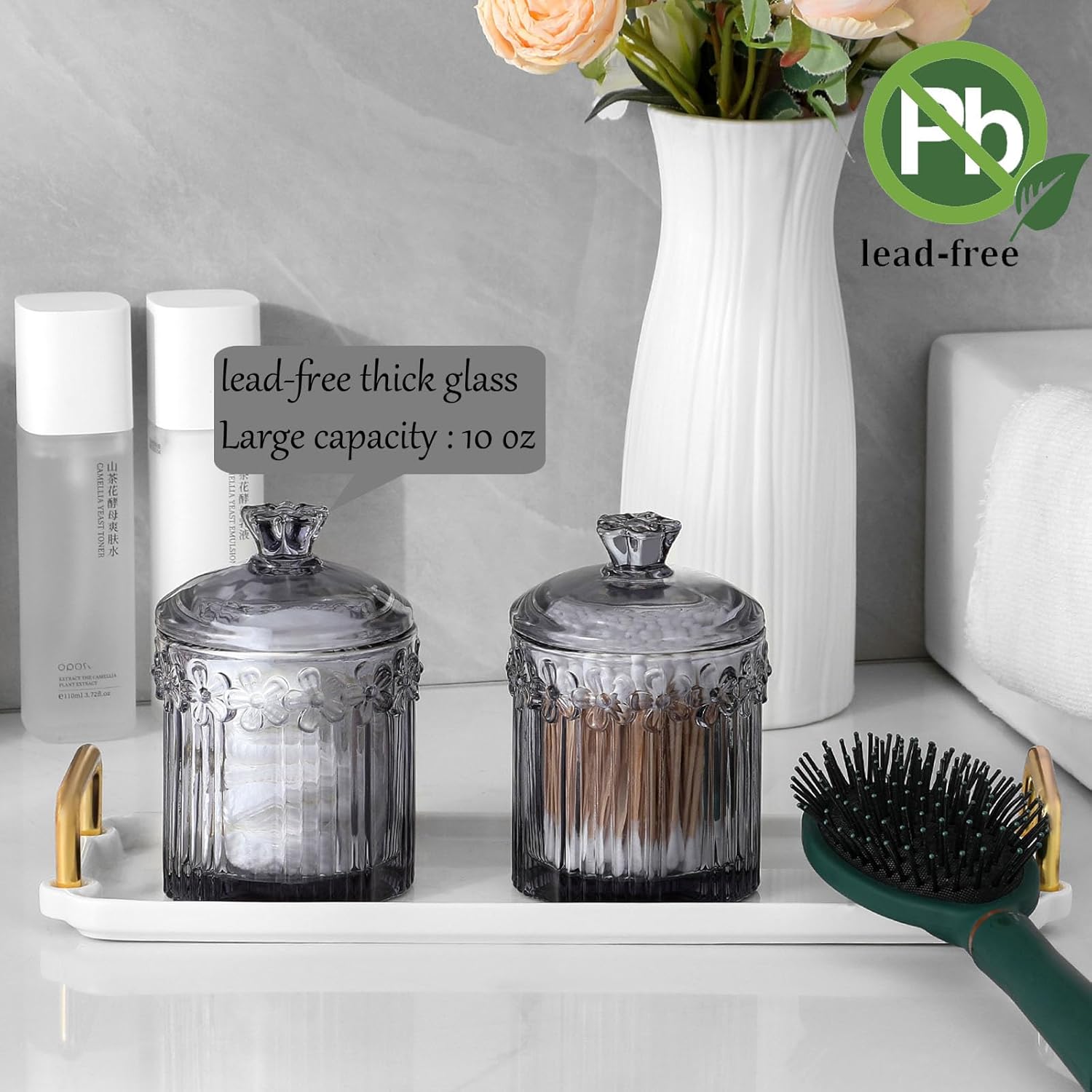 rejomiik 2 Pack Qtip Holder Glass Apothecary Jars with Lids Set Bathroom Canisters Dispenser Organizers and Storage for Cotton Swabs, Balls, Pads, Floss Picks, Candy, Grey