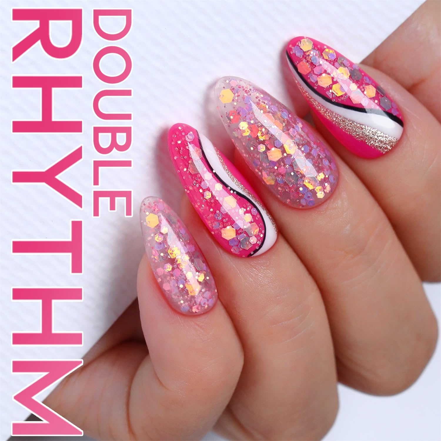 - Double Rhythm GEL POLISH: 1PC 15ML sparkly glitter pink gel polish offers a hassle-free application, super pretty sequins gel will bring you a different style manicure. Must apply with Base Gel and Top Coat, all need at least 60s UV / LED Lamp cure.