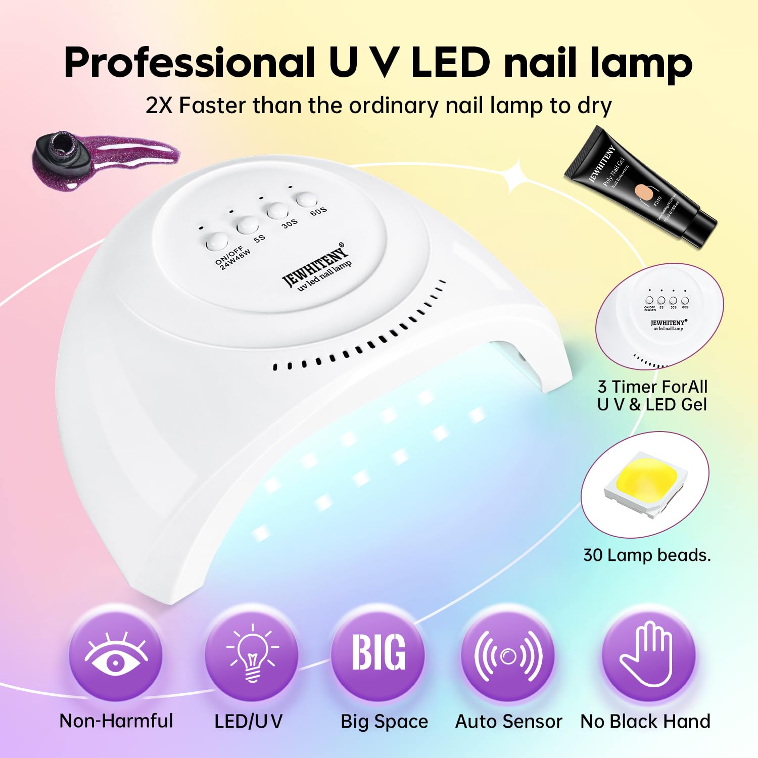 - [JEWHITENY POLY GEL&GEL Nail Polish NAIL KIT ]:1* 48W Nail lamp,14*15ml Poly nail gel, 27*5ml Gel nail polish,1*Base coat,1*Top coat,1*Matte top coat,1*30ml Poly gel slip solution,other basic nail art tools.