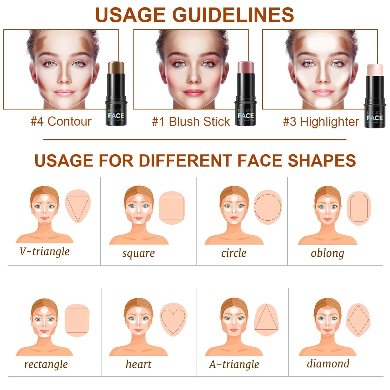 - HOW TO USE : After applying your care foundation, use the highlighter stick, contouring stick and blush stick to gently apply to your forehead, cheeks, jawline and nose, then use a soft makeup brush to smooth out until it blends into your skin for a natural, perfect matte finish look.