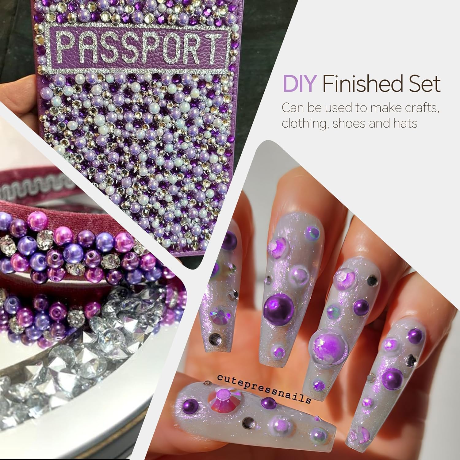 60g Light Amethyst Pearls Rhinestones for Crafts Mixed Size 3mm-10mm AB Color Round Half Pearls Flatback Pearl Beads and Resin Rhinestones Set for Face Art with Gel Gel