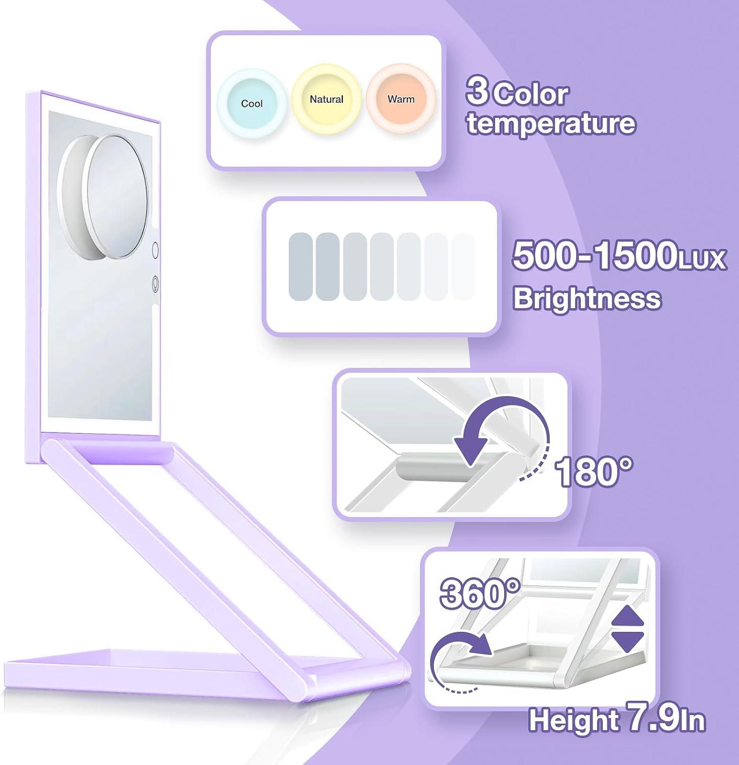 - TRAVEL MAKEUP MIRROR WITH 3 COLORS LIGHTING:Simply touch the screen can turn on/off the lights, our portable mirror with lights offers 3 delicate light colors (cool, natural and warm) with each adjustable brightness color mode for you to catch every exquisite makeup moment.