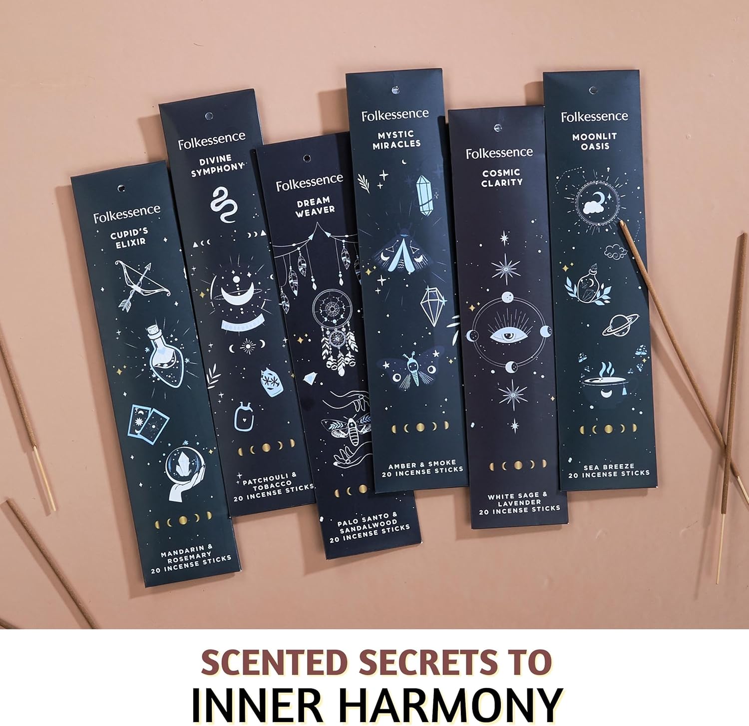 - Fragrance Notes – This incense pack combines uplifting citrus notes with breezy oceanic undertones with fragrances like palo santo incense, cedarwood incense, amber & smoke, white sage incense & lavender incense, mandarin incense, rosemary incense, patchouli incense & sea breeze. Suitable for meditation rooms, bedrooms, living areas, and even office spaces.