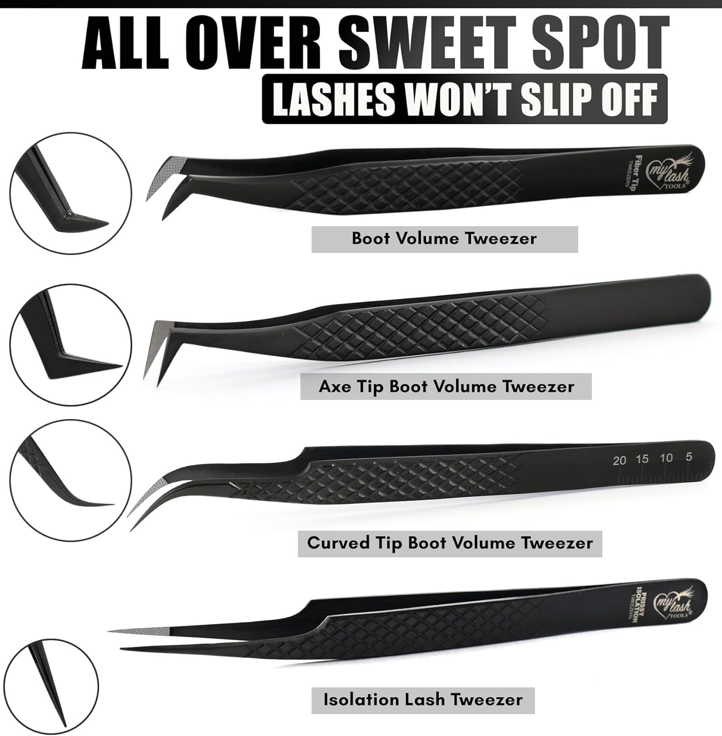 - 🌟 COMFORTABLE TO USE - Perfect for all lash artists—beginners to pros. Lightweight, durable, and precise. Ideal for volume lashes, with a complete grip and all over sweet spot. Fiber tip tweezers are easy to carry packed in case. Your ultimate lash tech must-haves! Prefect for isolation & mega volume.