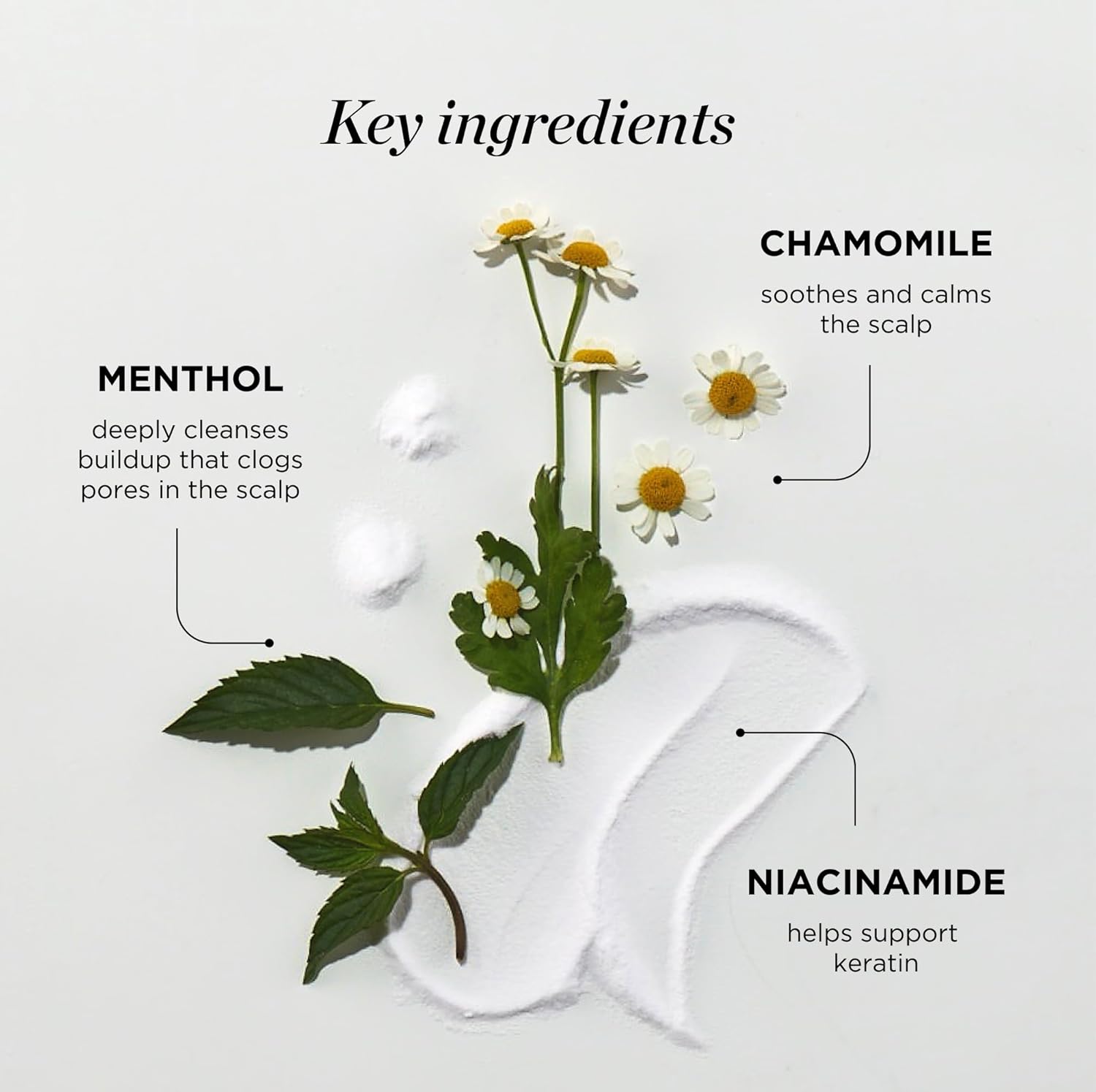 - Formulated with: Chamomile – Known to have calming effects. Niacinamide – Helps support keratin. Menthol – Known to invigorate scalp with a cooling sensation. Rosemary Oil - invigorate the hair and scalp for healthier, thicker, stronger hair. Formulated without: Parabens, silicones, sulfates and gluten.