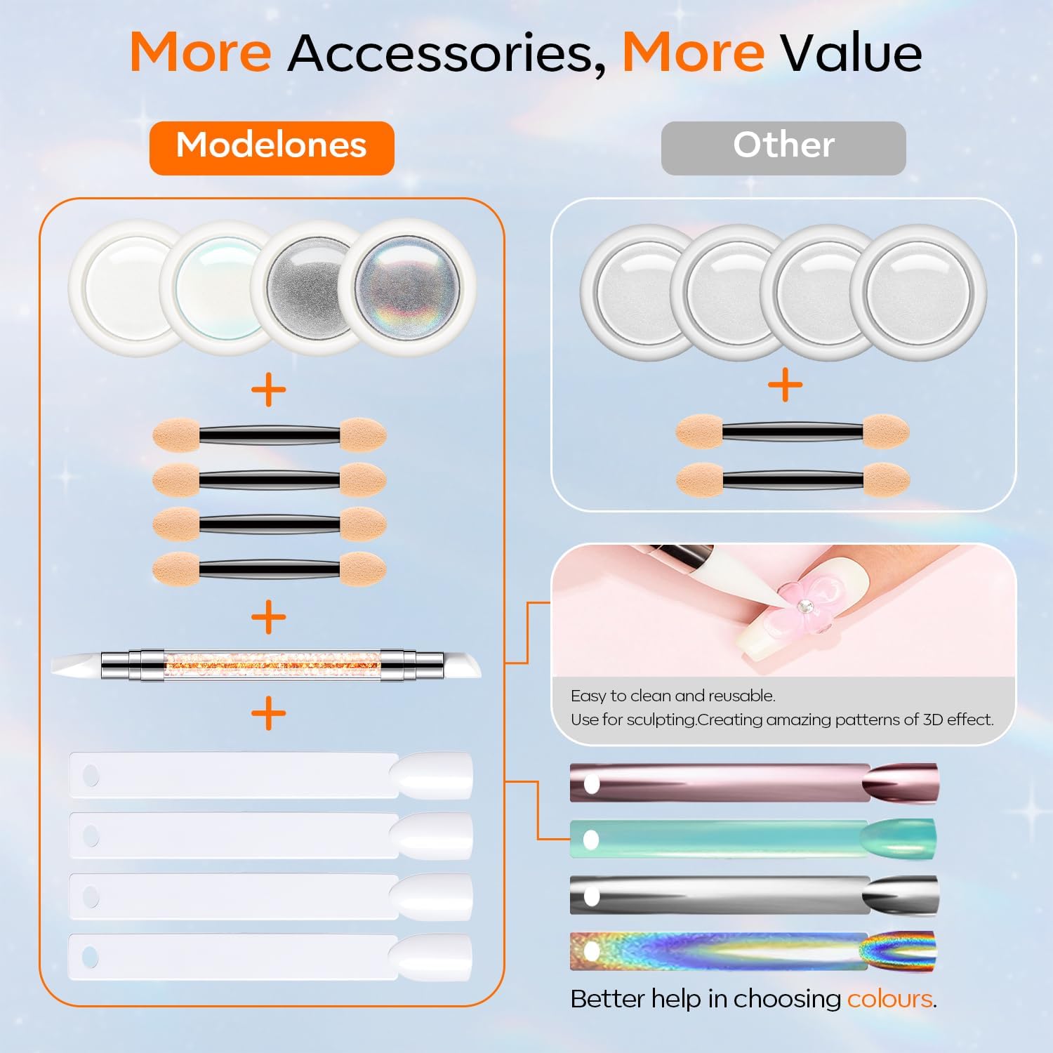 - Package Contents: 4 Jars Nail Chrome Powder (Laser Silver,holographic glitter powder,magic white chrome nail powder, Pearlescent Green). 1pc silicon nail brush, 4 pcs eyeshadow sticks and 4 swatch sticks