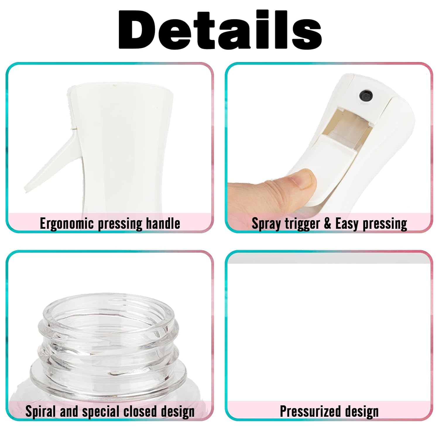 - 【High Quality】The continuous mist spray bottle is made of quality PET material with advanced technology, strong and not easily dented, durable and refillable. BPA-free, no smell, no leakage, and refillable. If anything goes wrong with your continuous spray bottle, please contact us directly.