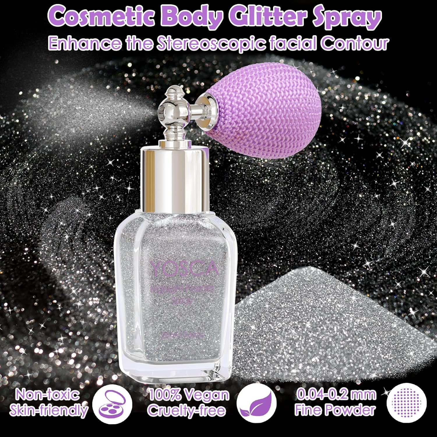 - Stunning Highlight Glitter: Yosca glitter spray is the way to infuse a touch of mesmerizing highlight sparkle into your style. Elevate your presence in any setting with its enchanting laser glitter effect. Our versatile spray body glitter is designed for all your highlight needs. Whether it’s for your hair, face, body, or outfit, our spray glitter will add that magical touch you desire.