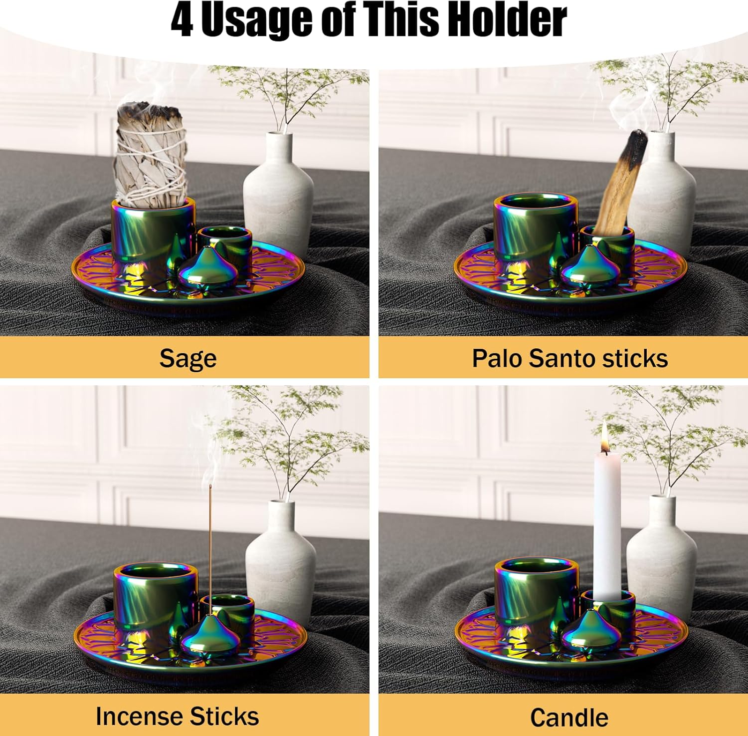 - 【4 IN 1 DESIGN】- This multi-functional incense burner can be used as incense holder, palo santo burner, sage burner and candle holder. Smallest hole is 0.19 inches,The palo santo holder is 1 inches, and the sage holder is 1.57 inches. they can be compatible with most of incense sticks, holy woods, and sage smudging bundles.
