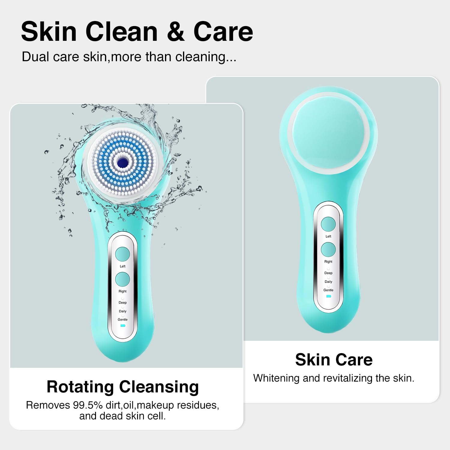 - Left & Right Rotation: This facial cleansing brush combine left and right spin cleansing way, provides more targeted cleaning mode. Left Rotation – Deep Purge Mode,effectively removes acne and trapped debris (nose/chin);Right Rotation – Daily Refresh Mode,Gentle yet thorough to Clears surface oil and impurities (cheeks/forehead).