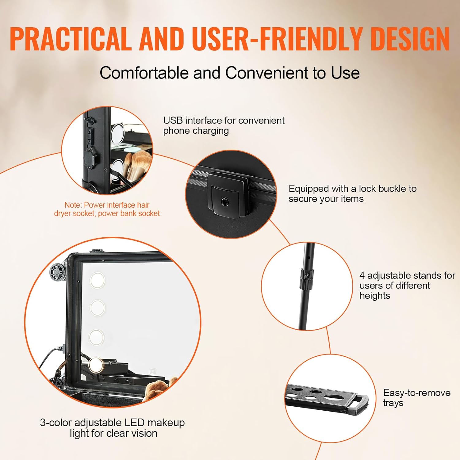 - User-friendly Design: The makeup case features a built-in full-screen mirror with 3 LED light colors, saving space and providing clear visibility. It has a USB interface for convenient phone charging, a lock buckle, and keys to keep your items secure. It also has adjustable support legs for the convenience of users of different heights, offering a comfortable and convenient user experience.