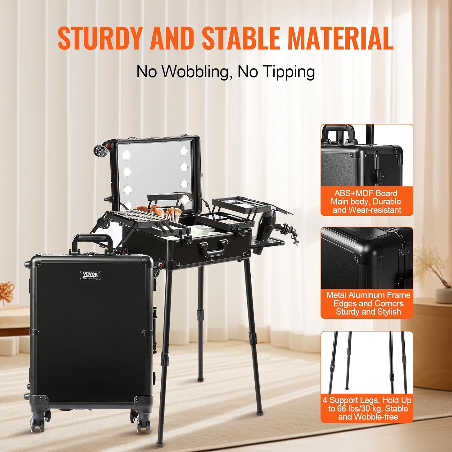 - Sturdy and Durable: The main body of the makeup case is made of ABS+MDF board, which is high-hardness and wear-resistant. The frame and corner connections are made of metal aluminum material, ensuring sturdiness and durability. The 4 support legs are strong and stable, capable of holding up to 66 pounds/30 kilograms without easily shaking or tipping over.
