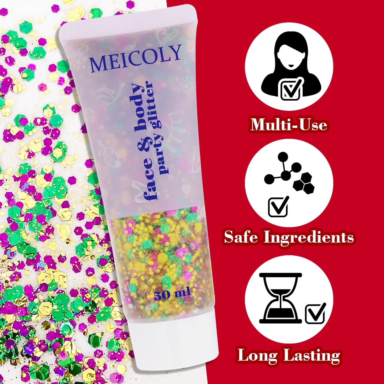 - 💜💚💛Self-Adhesive Body Glitter --- MEICOLY mardi gras glitter makeup is a glitter gel that is self-adhesive, so you don't need to use glue when using it,directly apply to anywhere you want with fingertips or brush,save your makeup time.This face body glitter can be used directly in the body or wherever you want to decorate,perfect mardi gras accessories for women