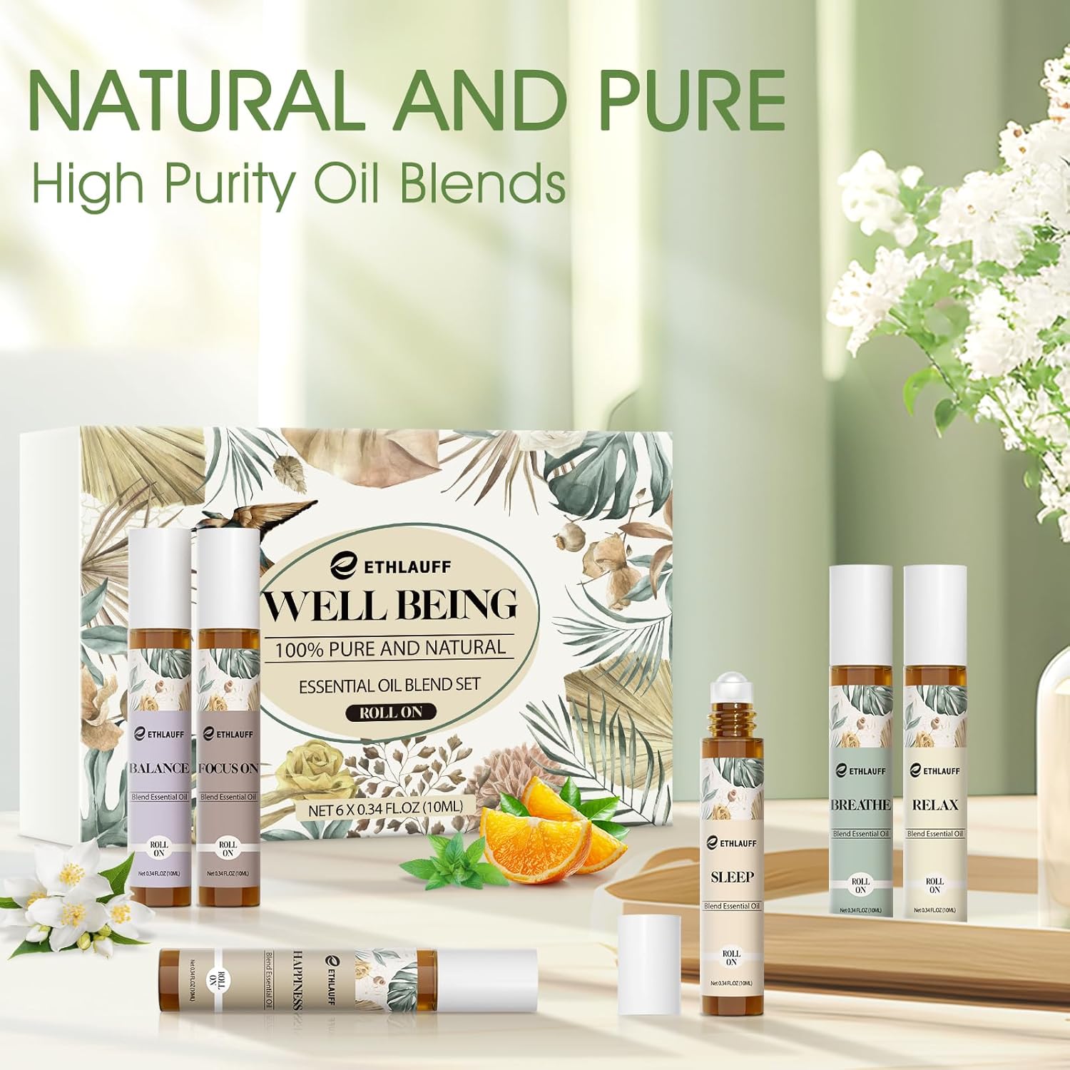 - High Quality Roll-on Set: A soft lavender scent oil with balsamic woody undertones of sandalwood oil, citrus and lemon to accompany you to have a cozy dream.The fresh aroma of bergamot is combined with the crispness of mint. Helps you refresh and get rid of the tiredness at work.Fresh jasmine fragrance mixed with sandalwood and frankincense. Keeps you energized and happy.Sweet citrus scent with the natural aroma of bergamot and eucalyptus oils to keep you in focus.