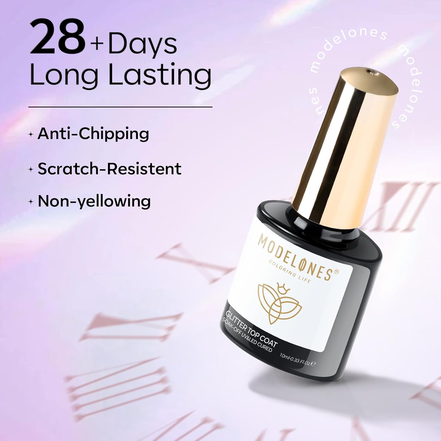 - Playful Glitter Top Coat: Modelones 2024 upgrade translucent top coat gel with sprinkled sequins glitter; Adds a vibrant mix of confetti-like glitter to your nails to achieve a festive and fun look, perfect for celebrations or adding a pop of color