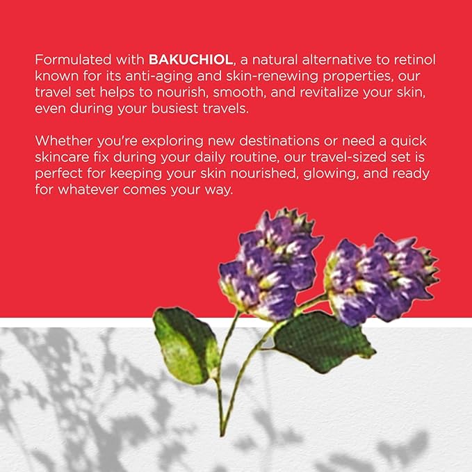 - BAKUCHIOL POWER: Formulated with bakuchiol, a natural alternative to retinol known for its anti-aging and skin-renewing properties, our travel set helps to nourish, smooth, and revitalize your skin, even during your busiest travels.