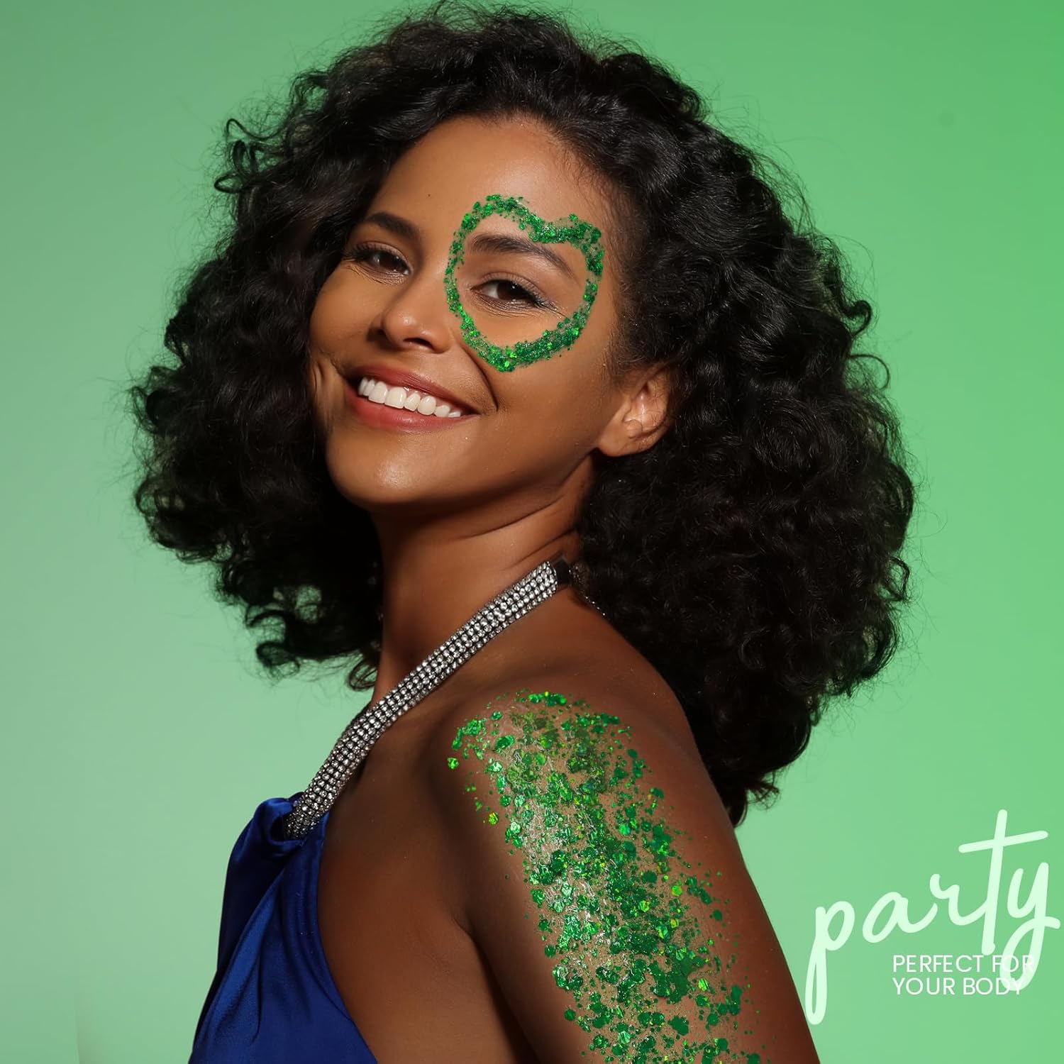 - LONG - LASTING AND COSMETIC GRADE GLITTER: Green face glitter gel is easy to dry and stay on well. The glitter gel lasts pretty much throughout the day. Once you apply it doesn't smear after it dries. Also sweat resistant, enjoy activities such as dancing or aerobics without worrying about your green glitter gel fall off