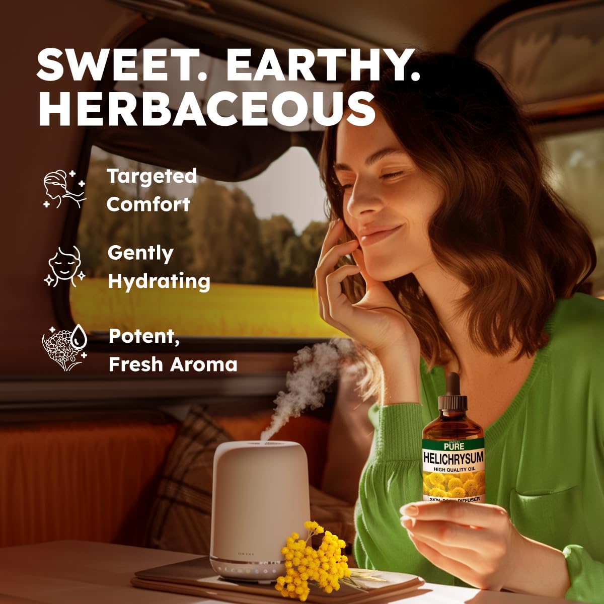 - Revitalize your space with Helichrysum essential oil. Sweet, earthy scent perfect for diffusers. Add 3-4 drops to diffuser or humidifier for soothing atmosphere that helps you unwind.