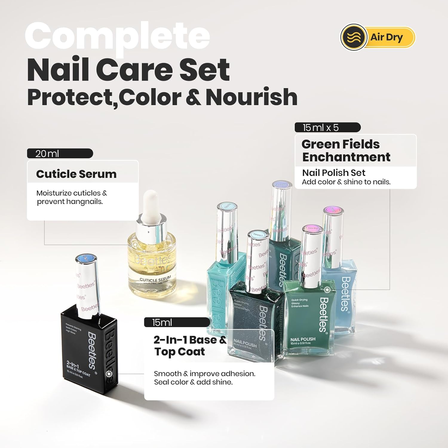 Beetles Green Nail Polish Set, 7 Pcs 5 Colors Light Green Blue Fingernail Polish, Cuticle Oil with 2IN1 Base&Top Coat Long Lasting Quick Dry Nail Polish Gfit Sets For Women