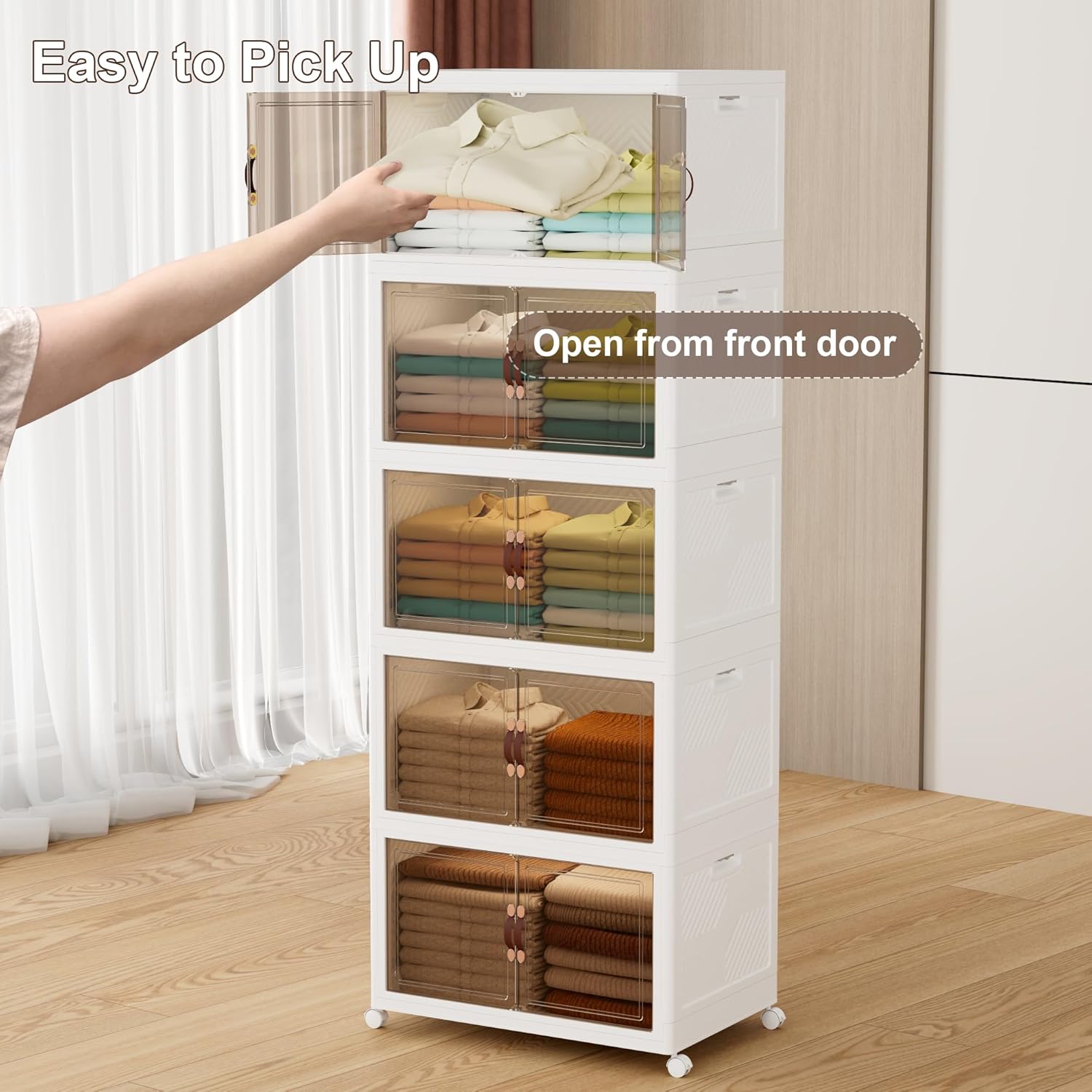 JOYMOOP Folding Storage Bins, 420 Quart Collapsible Storage Boxes with Wheels and Door, Stackble Plastic Storage Container for Clothing, Books and Sundries (XXL, 21 Gal Per, 5 Tiers)